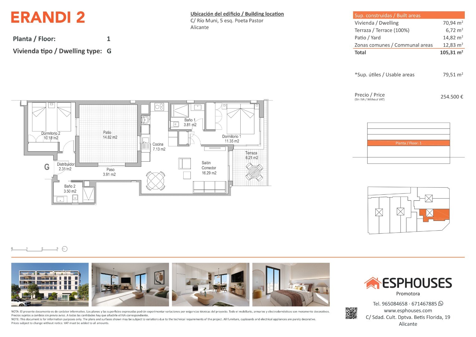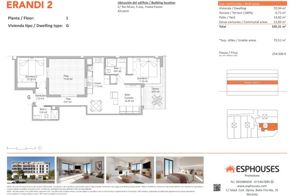 Acest apartament nou este situat la primul etaj al clădirii ERANDI 2 și are o suprafață construită de 70,94 m². Dispune de două dormitoare cu dulapuri încorporate, două băi complete, un living cu zonă de luat masa și bucătărie deschisă, o terasă orientată spre sud de 6,72 m² și o curte privată spațioasă de 14,82 m² — ideală pentru relaxare în aer l...iber pe tot parcursul anului.