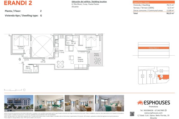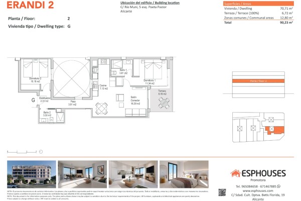 Acest apartament modern de construcție nouă este situat la etajul al doilea al clădirii ERANDI 2 — un proiect rezidențial elegant cu piscină comună pe acoperiș, în cartierul bine cunoscut La Florida, una dintre cele mai conectate și dinamice zone din Alicante. Cu o suprafață construită de 70,71 m², locuința dispune de două dormitoare cu dulapuri în...castrate, două băi, un living spațios cu zonă de dining și bucătărie deschisă, și o terasă orientată spre sud de 6,72 m² — ideală pentru a te bucura de soare toată ziua.
