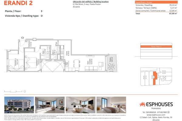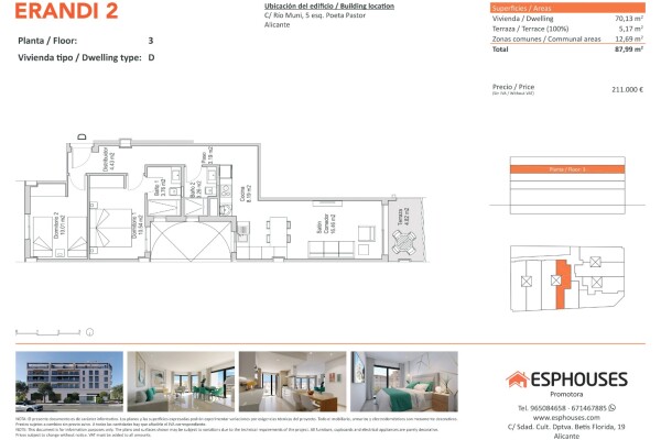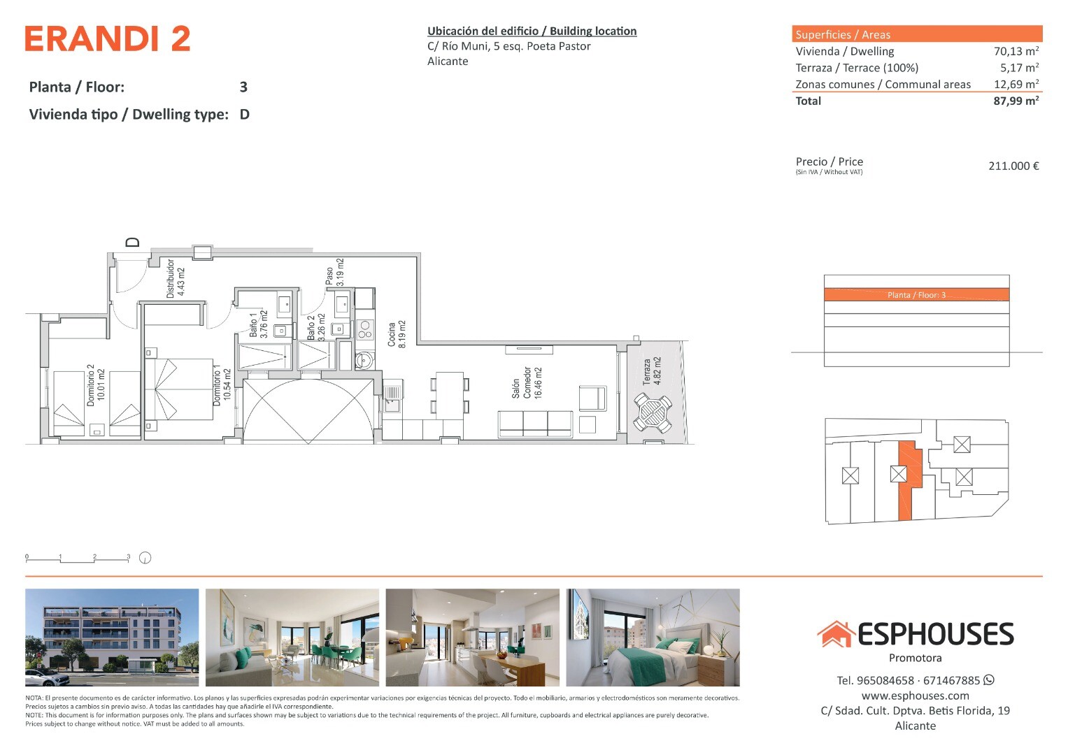 Acest apartament nou și confortabil, situat la etajul al treilea al clădirii ERANDI 2, se remarcă prin designul său modern și funcțional, finisaje excelente și locația privilegiată în cartierul La Florida — una dintre cele mai bine conectate și căutate zone din Alicante.