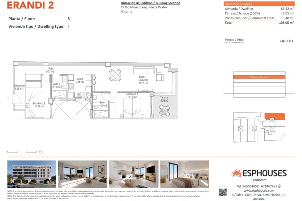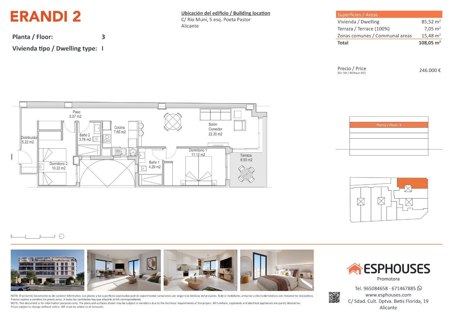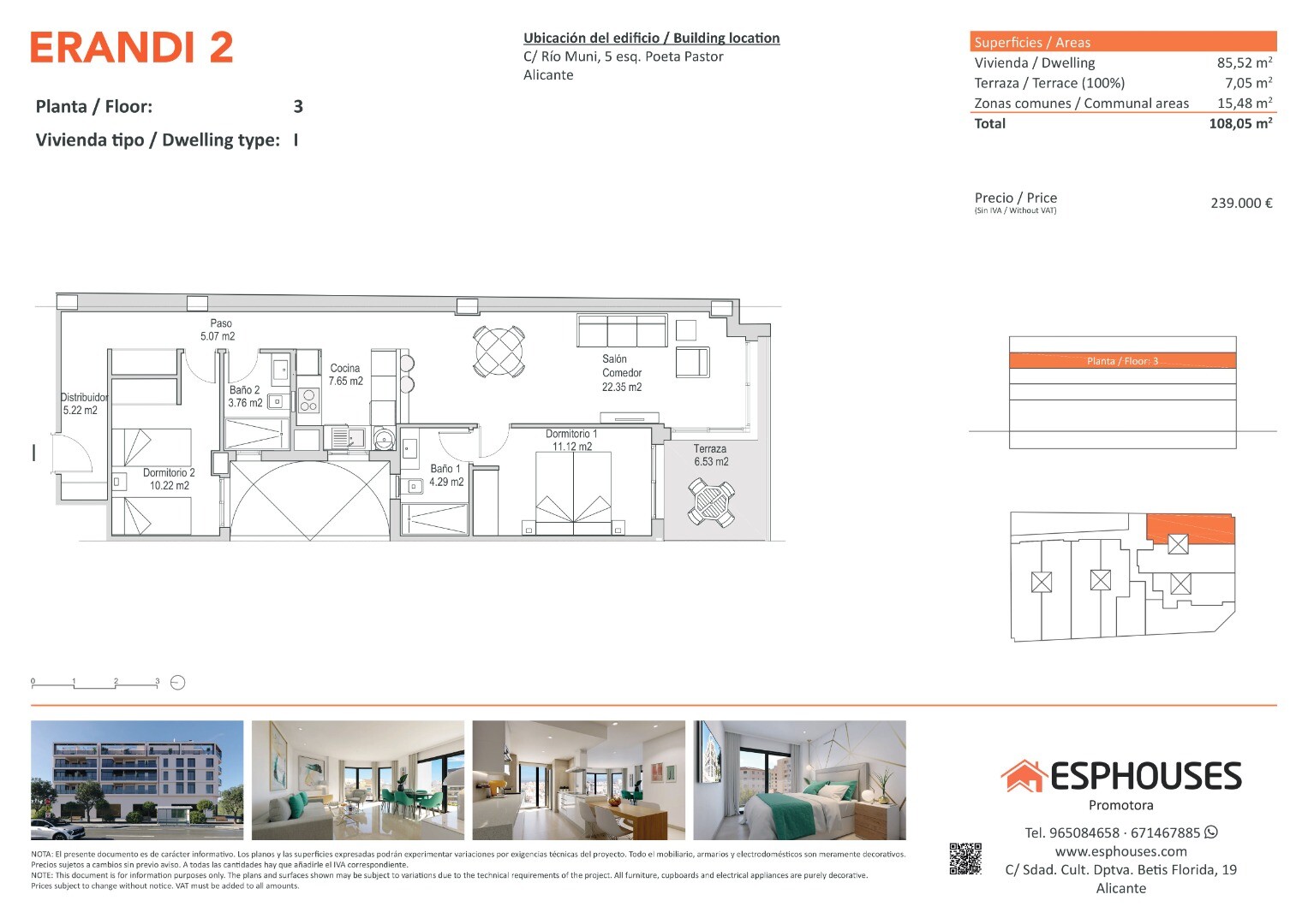 Acest apartament luminos, de construcție nouă, se află la etajul trei al clădirii ERANDI 2 și oferă o suprafață construită de 85,52 m². Cu o orientare excelentă spre sud și o compartimentare practică, este alegerea ideală în cartierul bine conectat La Florida din Alicante.