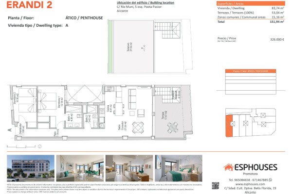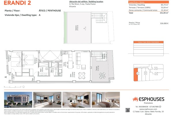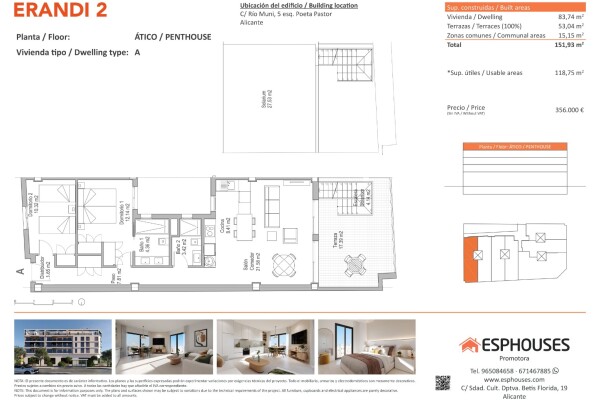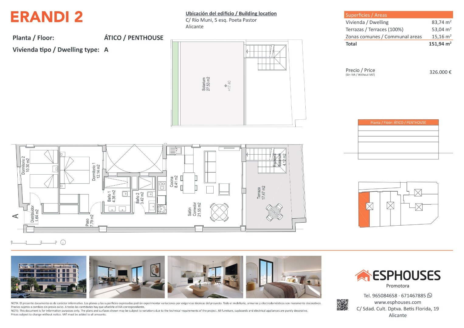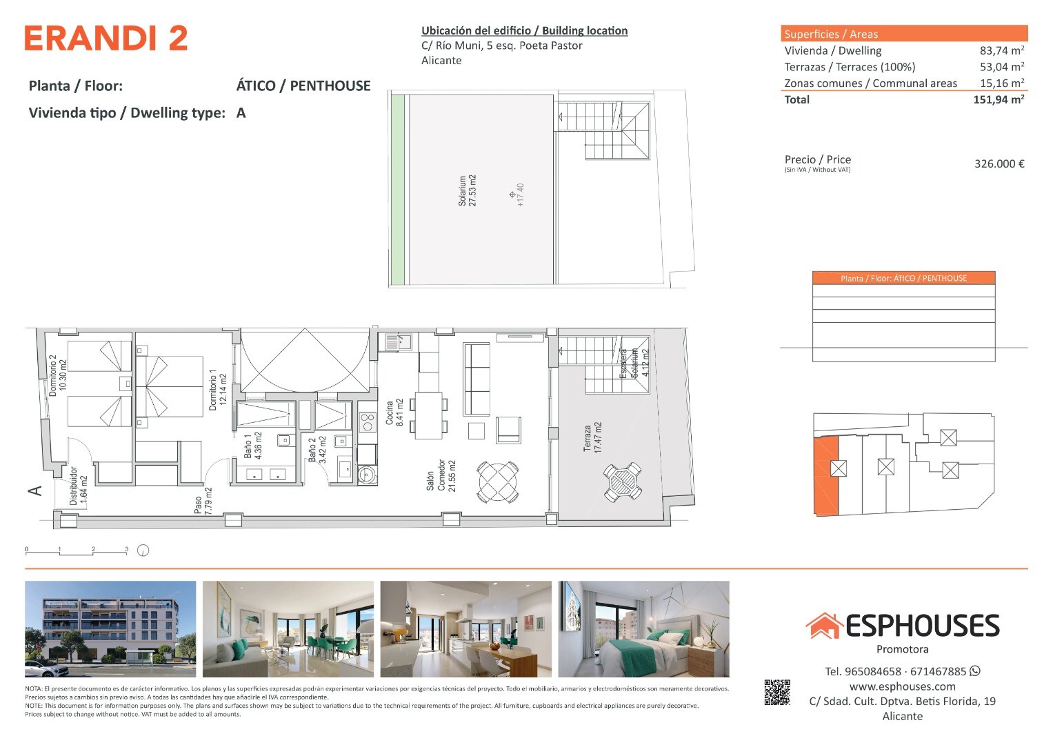 Acest penthouse exclusivist, de construcție nouă, este situat la etajul al patrulea al clădirii ERANDI 2 și se remarcă prin spațiile exterioare generoase și orientarea vestică, perfectă pentru a profita de lumina naturală pe tot parcursul după-amiezii. Suprafața construită este de 85,52 m² și include două dormitoare cu dulapuri încorporate, două bă...i, un living luminos cu zonă de luat masa și o bucătărie deschisă, modernă.