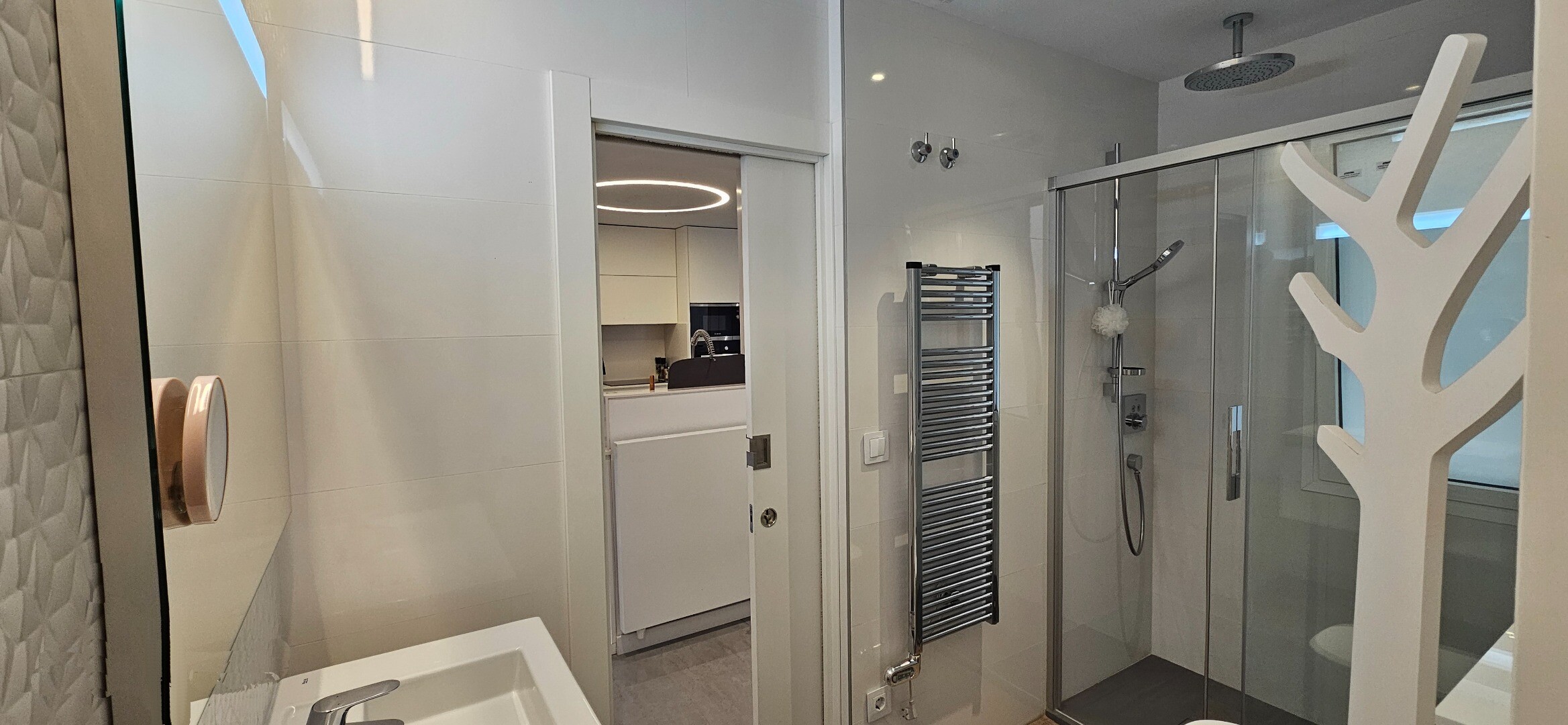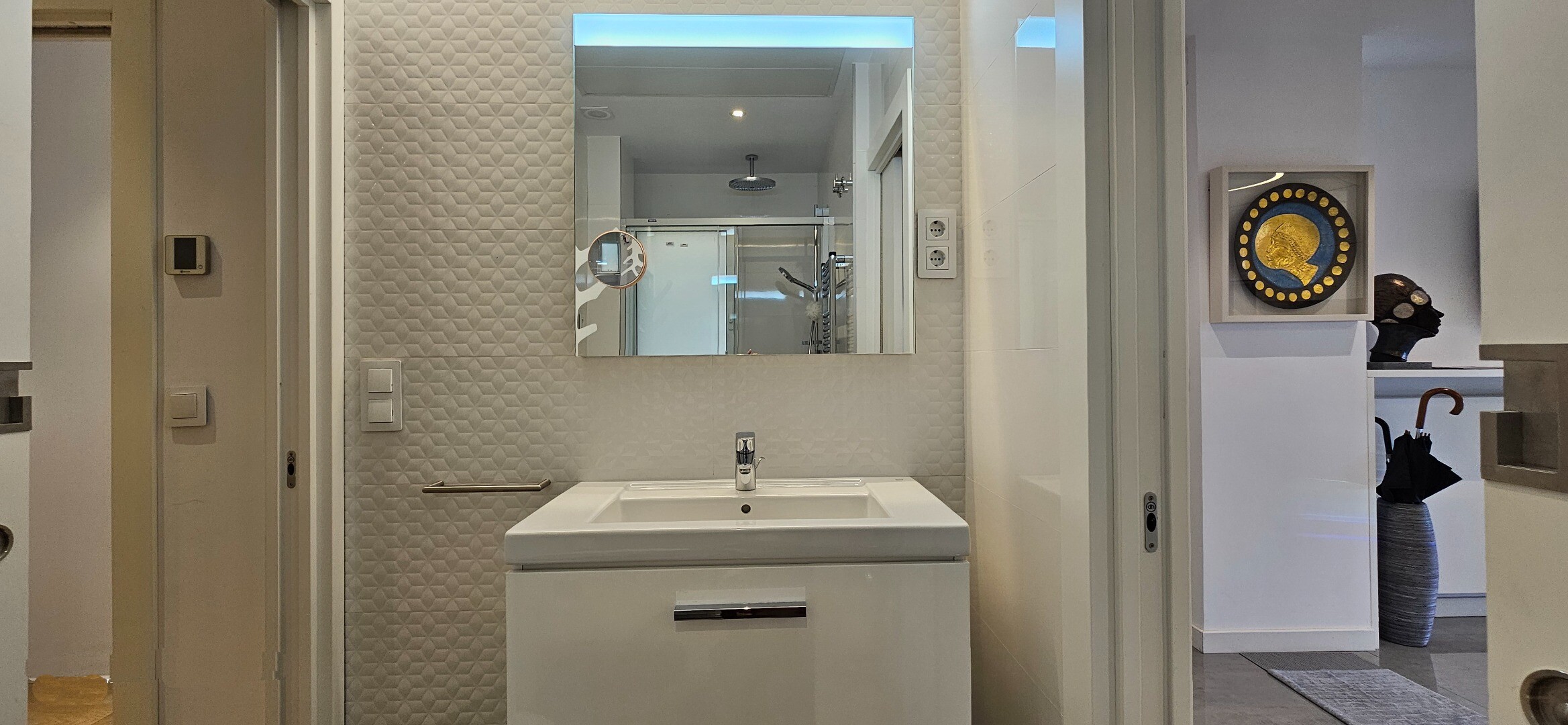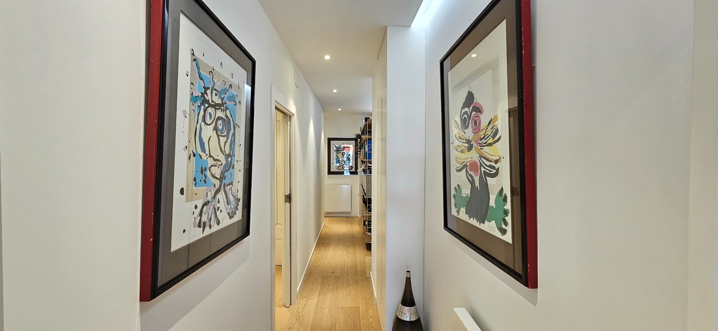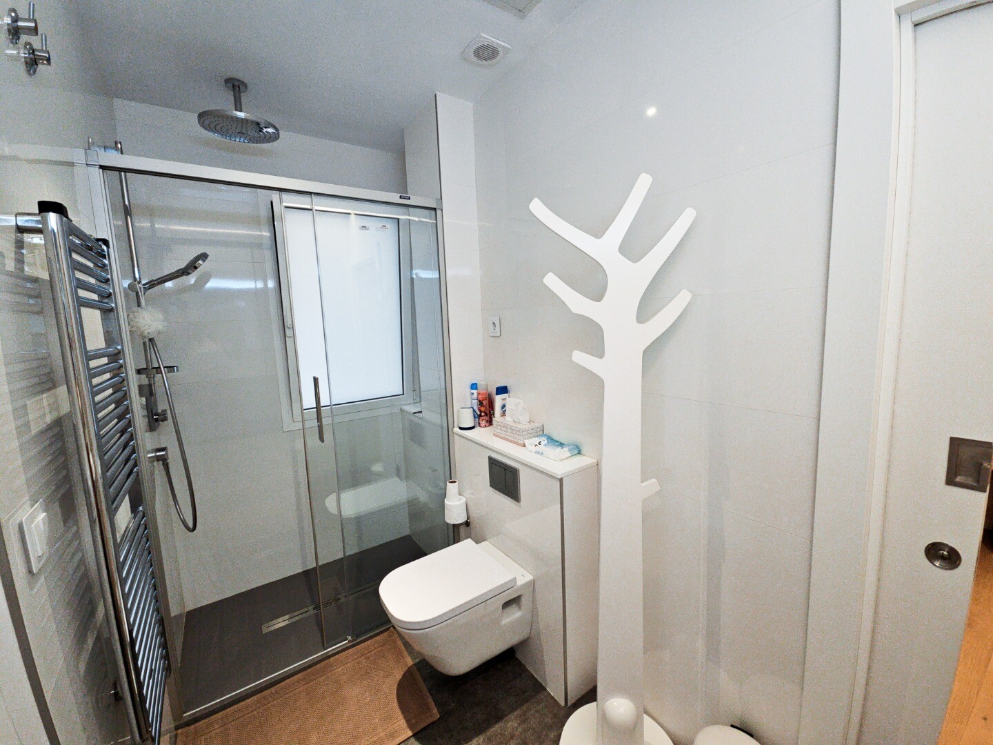 În ceea ce privește facilitățile, locuința dispune de încălzire centrală pe gaz natural prin intermediul radiatoarelor Irsap și aer condiționat prin conducte cu sistem Airzone, cu două unități independente pentru zona de zi și de noapte. Pereții netezi, mobilierul realizat la comandă și ușile glisante contribuie la o estetică curată și modernă, optimizând fiecare spațiu.
