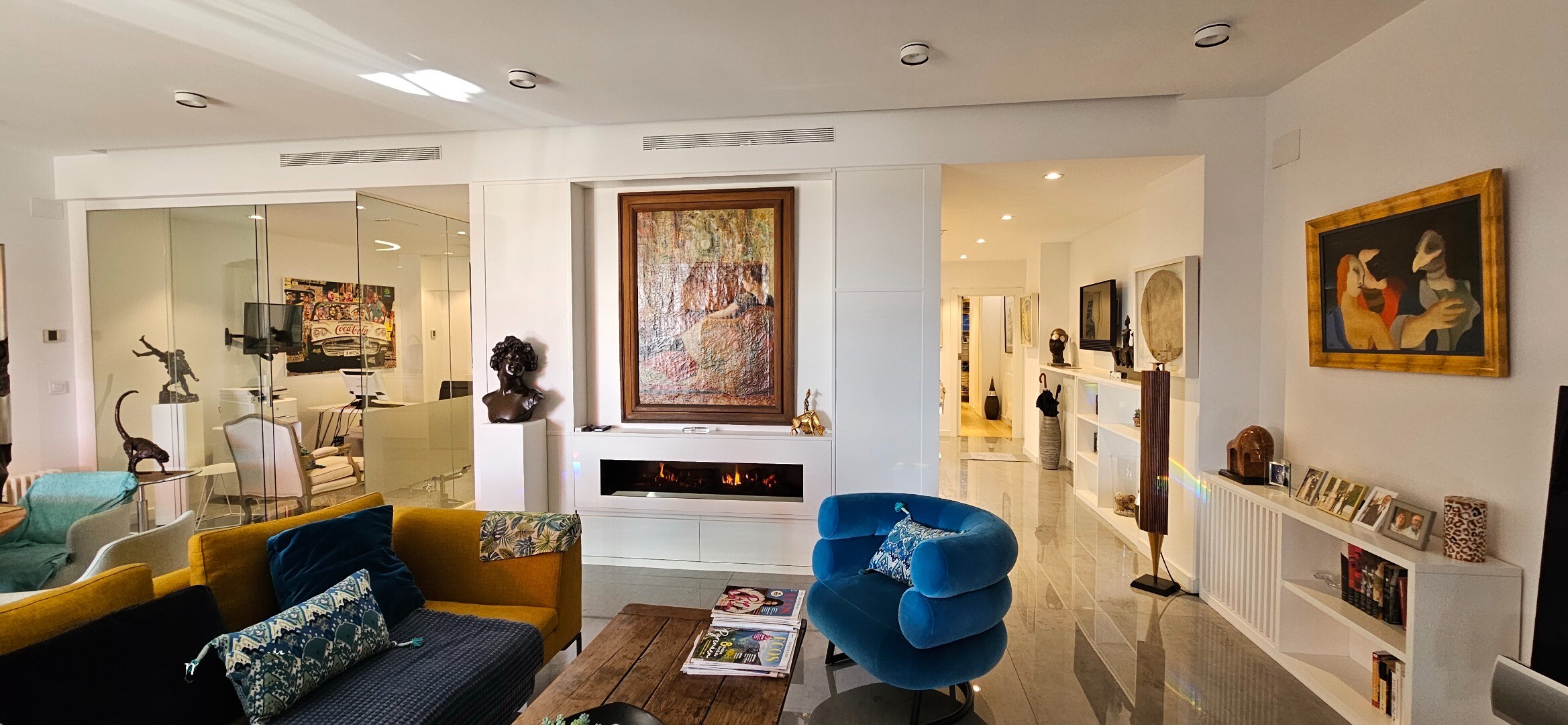 Livingul-sufrageria reprezintă inima casei: o zonă spațioasă și sofisticată, pusă în valoare de un șemineu electric decorativ care adaugă căldură și distincție. Acest spațiu se deschide direct spre o terasă magnifică orientată spre sud, asigurând lumină naturală excelentă pe tot parcursul zilei și creând o conexiune perfectă între interior și exterior, perfectă pentru a vă bucura de climatul mediteranean și de priveliștea mării.