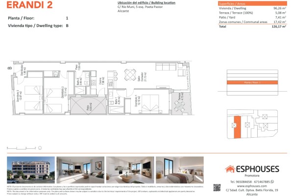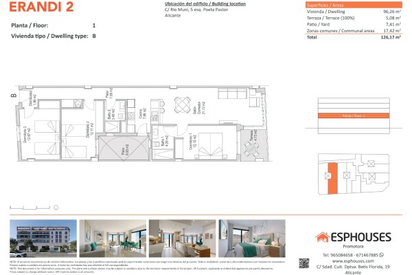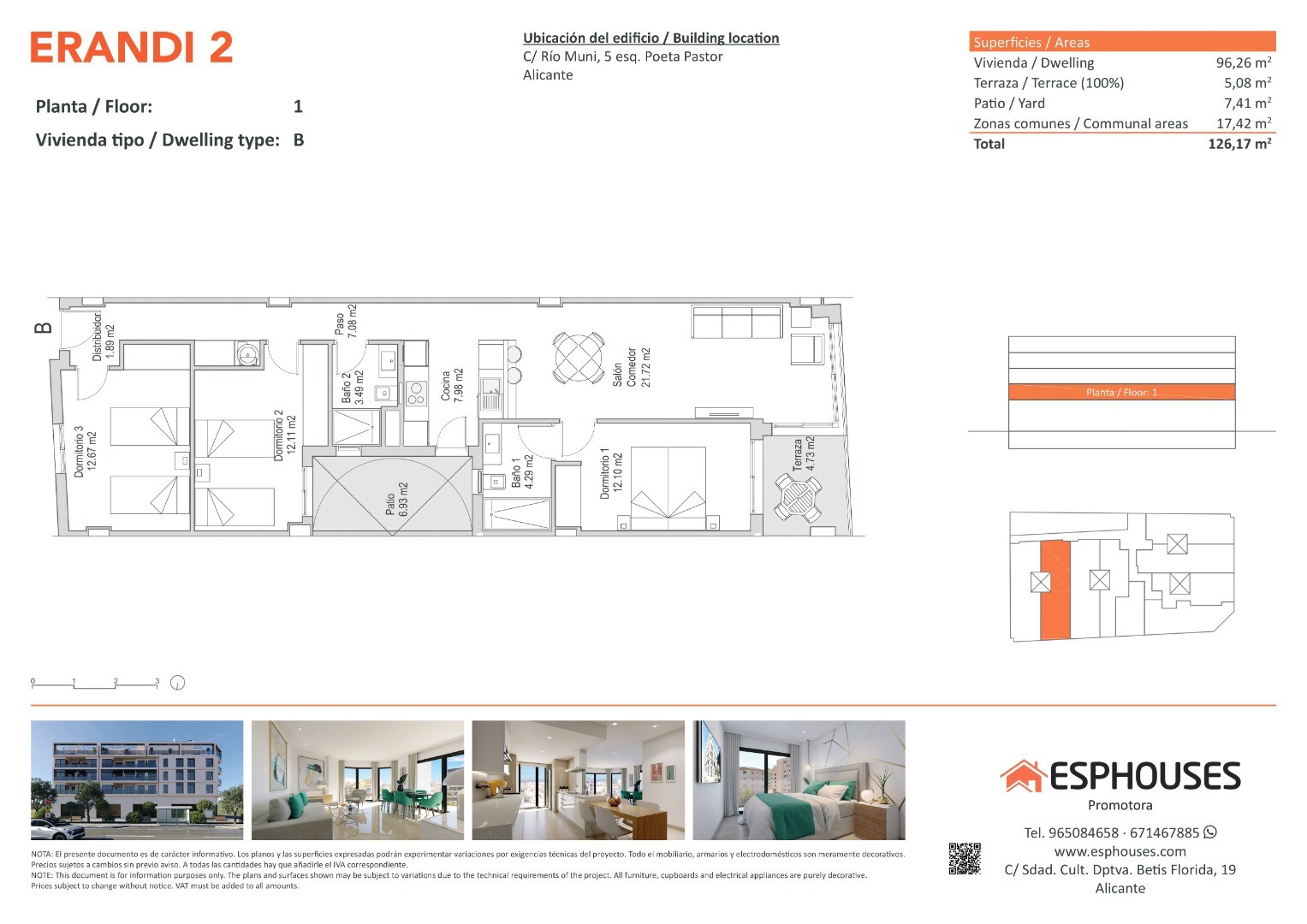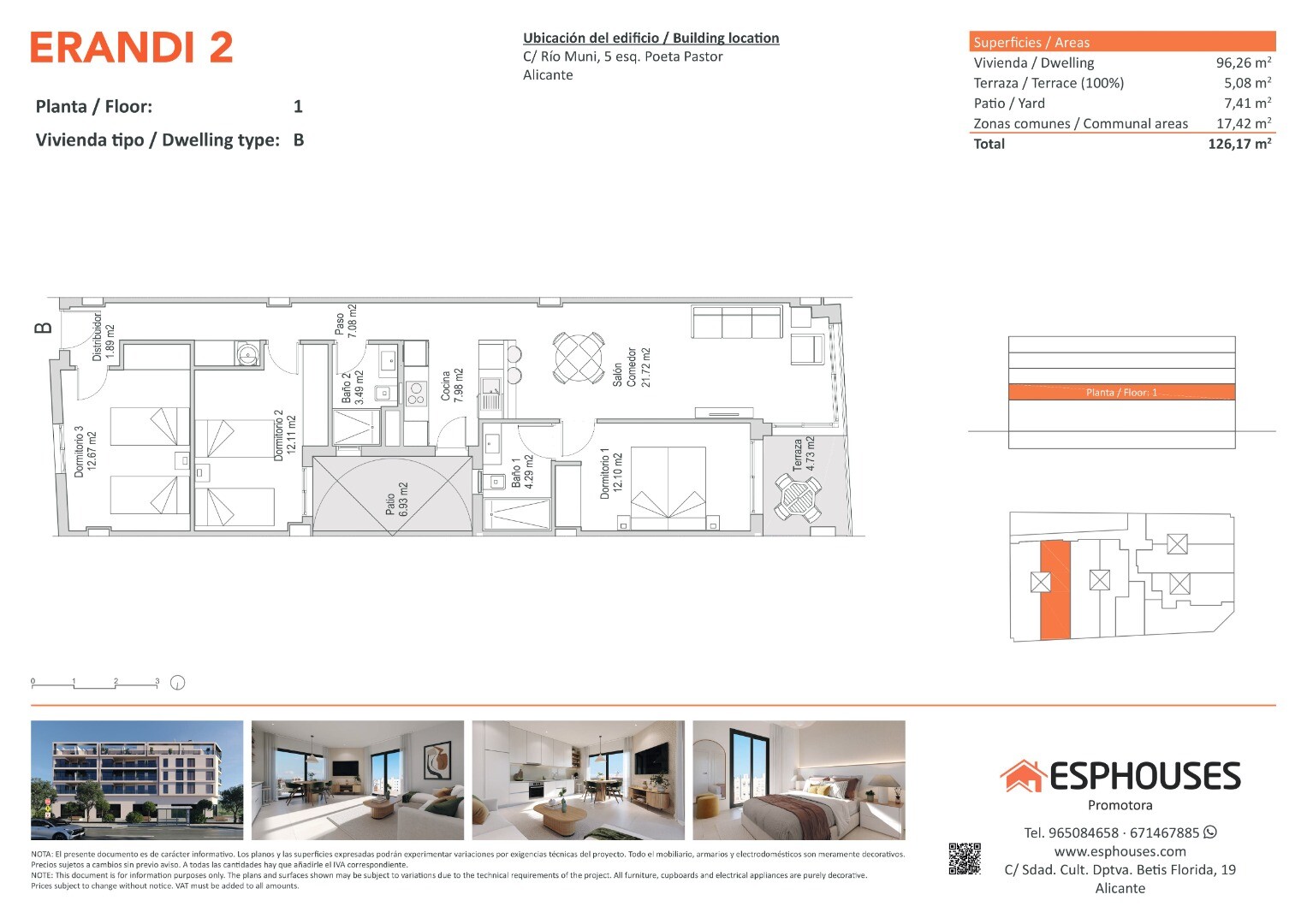 Acest apartament nou se află la etajul întâi al clădirii ERANDI 2 și are o suprafață construită de 96,26 m². Designul său modern include o terasă de 5,08 m² și o curte interioară de 7,41 m² — perfecte pentru a te bucura de climatul mediteranean.