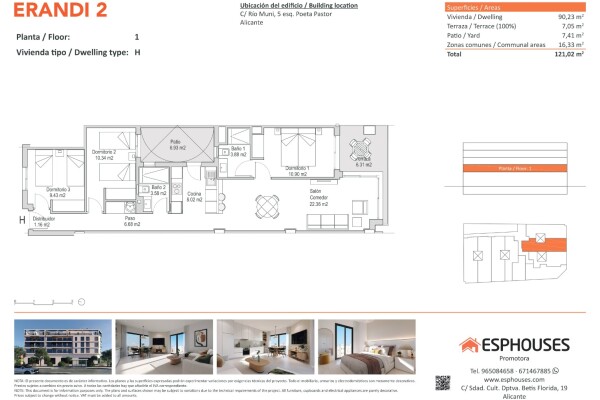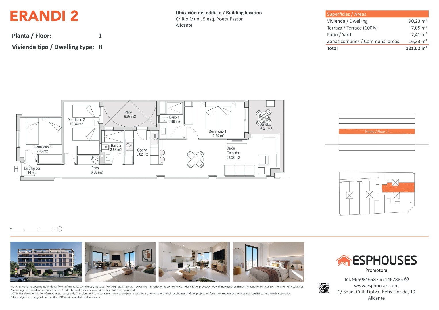 Acest apartament nou este situat la primul etaj al clădirii ERANDI 2 și are o suprafață construită de 90,23 m². Dispune de trei dormitoare cu dulapuri încorporate, două băi complete, un living cu zonă de luat masa și bucătărie deschisă, o terasă orientată spre sud de 7,05 m² și o curte privată de 7,41 m² — ideală pentru relaxare în aer liber pe tot... parcursul anului.