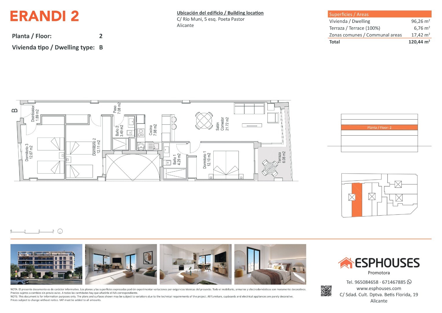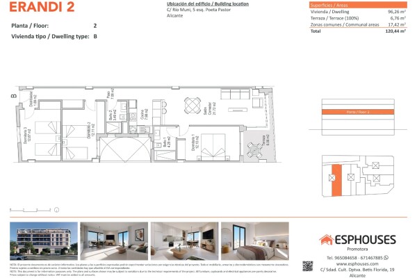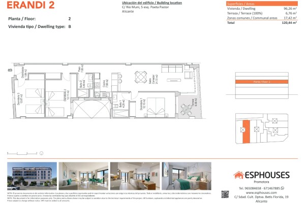 Această locuință modernă, situată la etajul al doilea al clădirii ERANDI 2, îmbină designul actual cu confortul și o locație excelentă în cartierul La Florida – una dintre cele mai bine conectate și dezvoltate zone din Alicante. Cu o suprafață construită de 96,26 m², apartamentul oferă trei dormitoare cu dulapuri încastrate, două băi complete, un l...iving cu zonă de luat masa și bucătărie deschisă, precum și o terasă de 6,76 m² orientată spre vest, ideală pentru lumina de după-amiază.