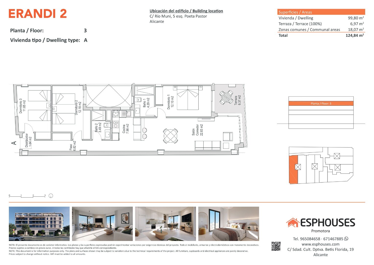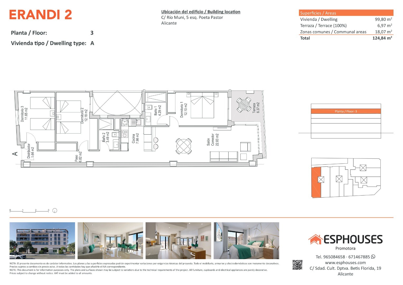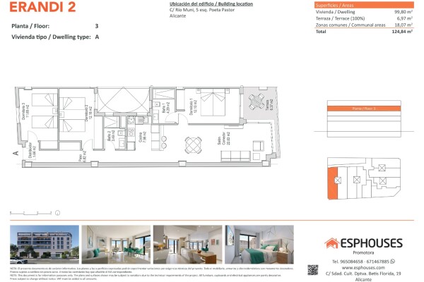 Acest apartament spațios de tip nou se află la etajul al treilea al clădirii moderne ERANDI 2, o reședință cu piscină comună pe acoperiș, situată în cartierul bine conectat și consolidat La Florida din Alicante. Suprafața construită este de 99,80 m² și include trei dormitoare cu dulapuri încastrate, două băi, un living generos cu bucătărie deschisă... și o terasă de 6,97 m² orientată spre vest, ideală pentru lumina după-amiezii.