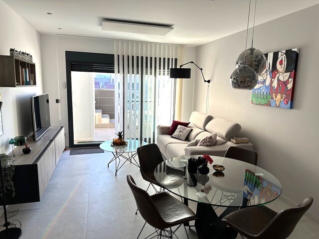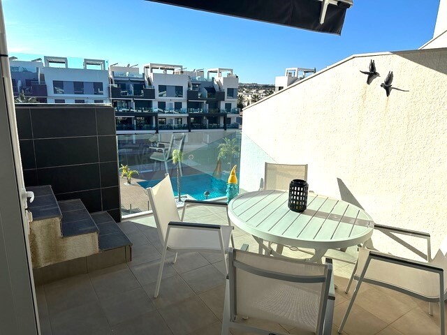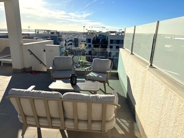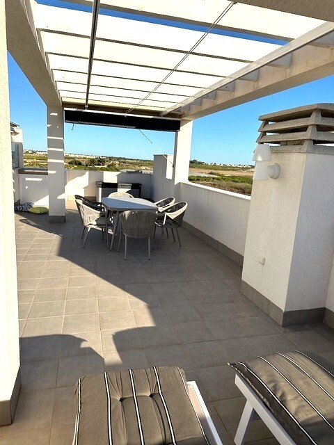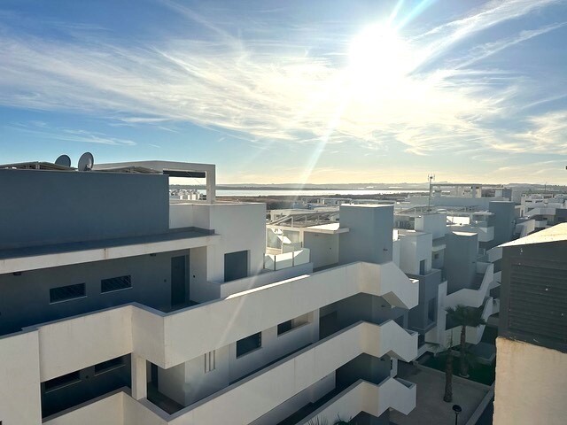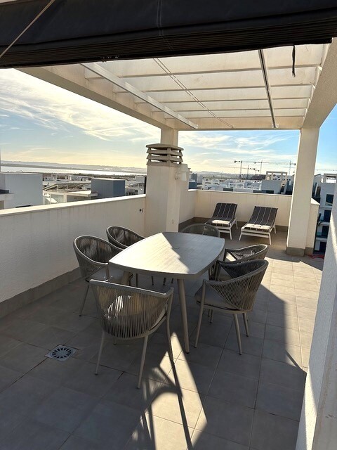 Solar de 77m2. Acest frumos penthouse pe colț este o adevărată bijuterie în urbanizarea căutată El Raso, la doar câteva minute de Guardamar del Segura, cu plajele sale cu nisip auriu. Cu o locație privilegiată și vederi uimitoare, această proprietate oferă un stil de viață excepțional. Bucurați-vă de priveliști frumoase asupra plantațiilor de lămâi... și a lagunelor de sare. Pacea și frumusețea naturală sunt garantate. Acest penthouse a fost întreținut cu grijă și arată ca nou. Gata să te muți și să te bucuri. Terasa spațioasă la soare de 77 m2 este locul perfect pentru a vă relaxa în timp ce priviți apusul soarelui peste saline. Imaginați-vă cine în aer liber și momente de neuitat cu prietenii și familia. Dotat cu materiale de calitate superioara, electrocasnice marca A si mobilier de inalta calitate, acest penthouse ofera confort si eleganta. Panouri de incalzire, jaluzele, copertina pe terasa, mobilier de gradina si loc de parcare subteran. Bucurați-vă de două piscine frumoase, sală de sport, zonă de wellness spa, minigolf, tenis de masă și terenuri de petanque. Acesta este un apartament la cheie cu tot ce aveți nevoie pentru a trăi stilul de viață mediteranean. Nu rata această ocazie unică!