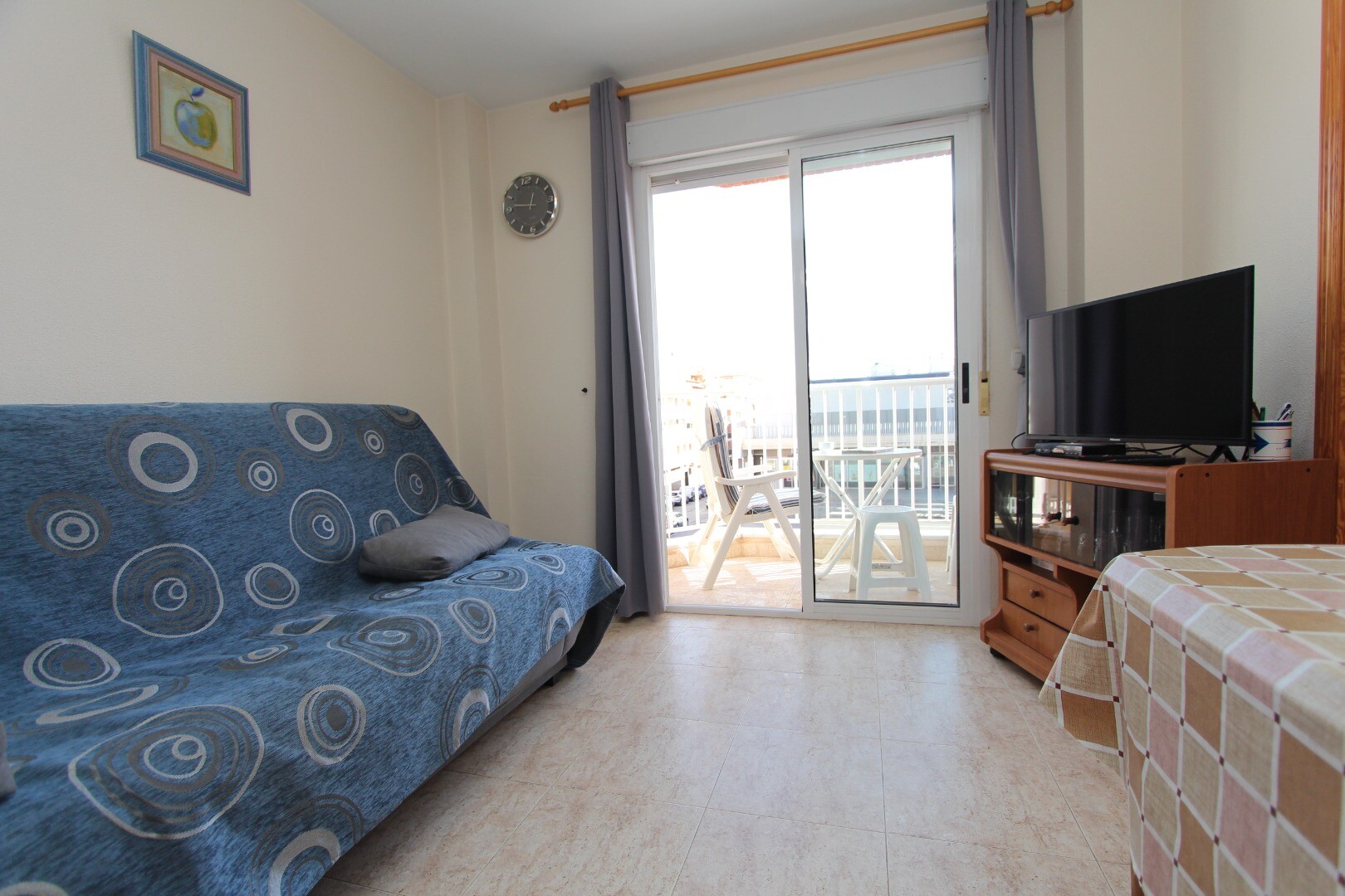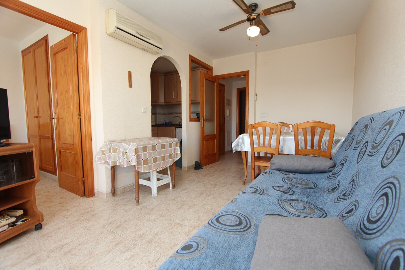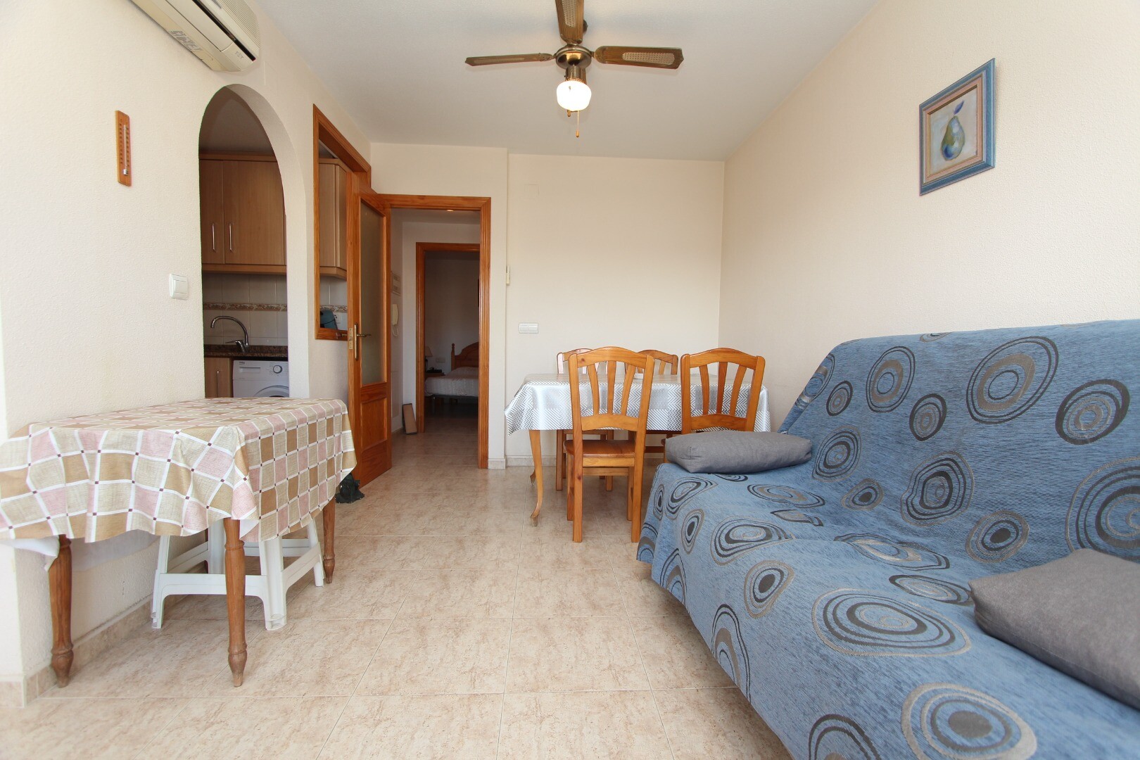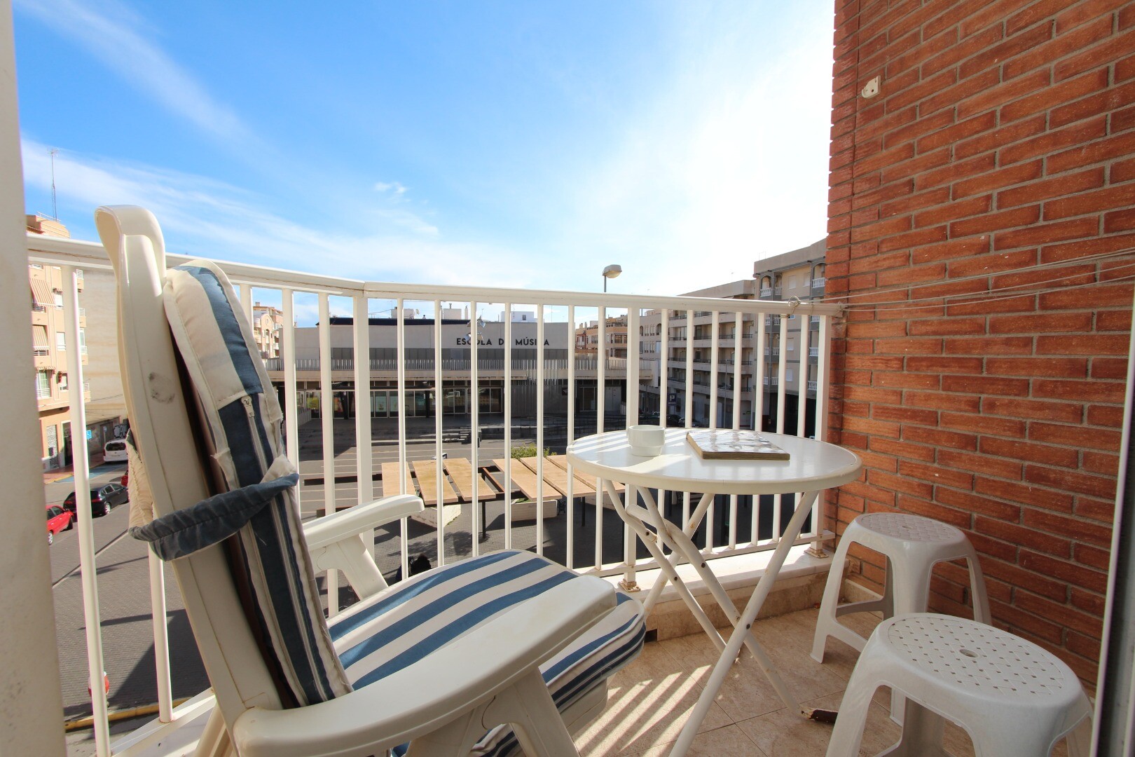 Apartament situat central, la 300 de metri de coastă și la câțiva pași de toate facilitățile imaginabile. Apartamentul are 2 dormitoare, inclusiv un dormitor matrimonial spatios si 1 baie. Din living are acces la o terasă cu vedere deschisă la școala de muzică. Are o terasă comună pe acoperiș unde se află și depozitul. La aeroportul din Alicante se... poate ajunge în aproximativ 30 de minute.