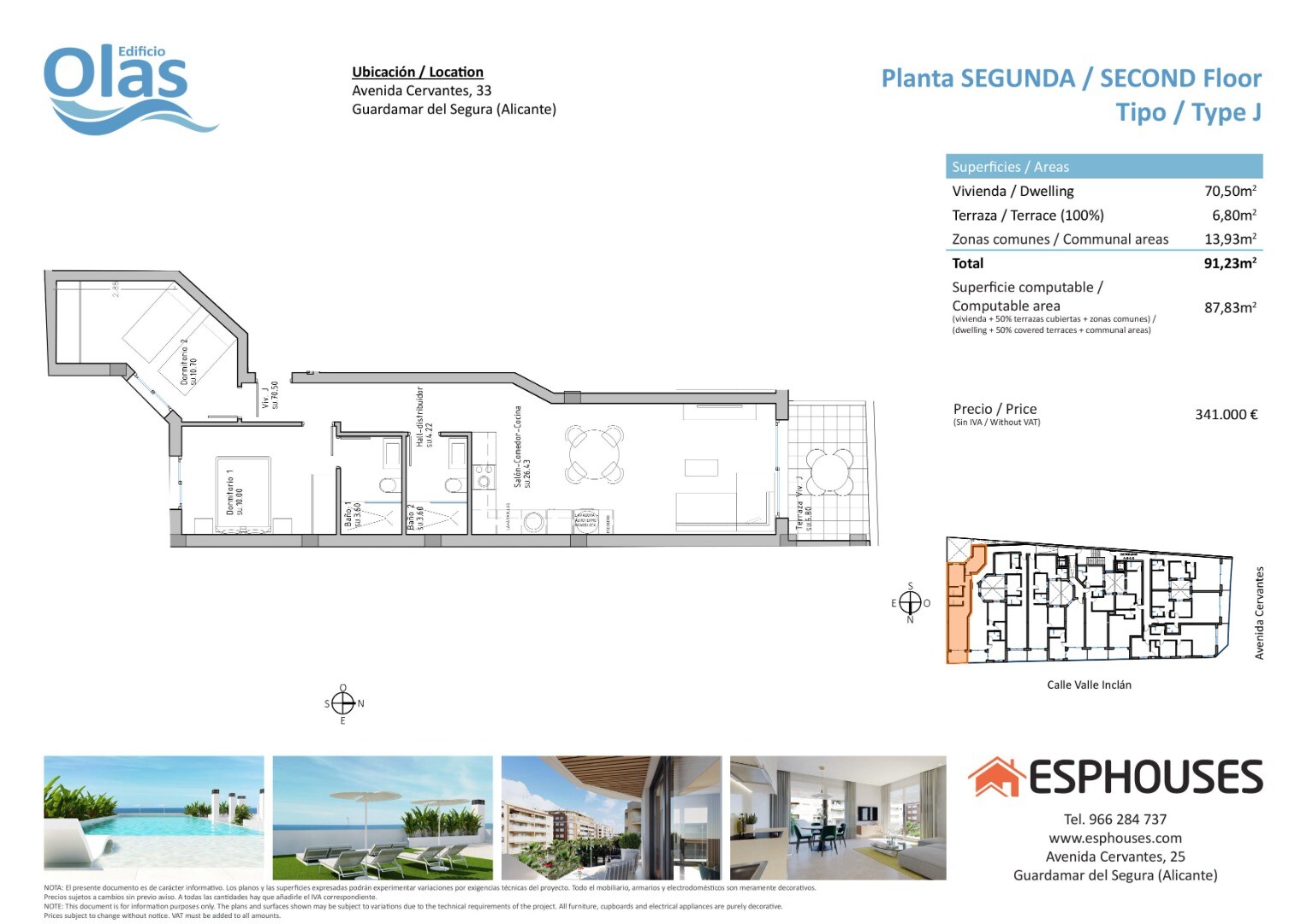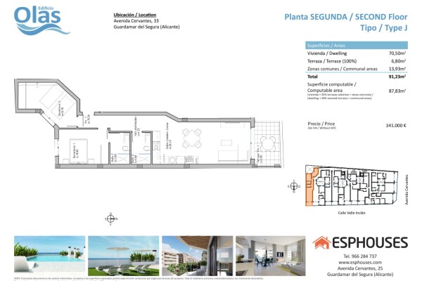 Situat pe prestigioasa Avenida de Cervantes, într-una dintre cele mai căutate zone din Guardamar del Segura, se va afla Edificio Olas. Această alegere perfectă oferă o proximitate ideală față de plajă și o gamă largă de servicii. Ieșind în evidență din mulțime, această clădire exclusivistă va avea o piscină și un solar pe acoperiș, oferind un spați...u de relaxare și bucurie pentru rezidenți. Apartamentul în cauză va fi compus din două dormitoare, două băi, un living-sufragerie luminos cu bucătărie integrată și o terasă confortabilă. Cu o suprafață construită de 87,83 metri pătrați și o terasă de 6,80 metri pătrați, acesta oferă un spațiu confortabil și modern. Apartamentul va fi dotat cu aer condiționat și domotică, permițând rezidenților să controleze și să automatizeze diverse aspecte ale locuinței pentru un confort și o eficiență energetică sporite. Bucătăria va fi dotată cu aparate de înaltă calitate, cum ar fi cuptor, mașină de spălat vase, frigider-congelator, hotă și plită cu inducție, creând un spațiu funcțional și modern pentru a găti și a se bucura de mese cu familia și prietenii. În plus, există opțiunea de a achiziționa un loc de parcare și o cameră de depozitare în clădirea însăși, oferind un confort și un spațiu de depozitare mai mare pentru rezidenți. Edificio Olas va fi situat într-o locație privilegiată, aproape de plajă și înconjurat de o mare varietate de servicii și facilități, cum ar fi restaurante, magazine, supermarketuri și zone de agrement. Guardamar del Segura, cunoscut pentru plajele sale cu nisip fin și mediul natural frumos, oferă un stil de viață liniștit și relaxat, având în același timp toate facilitățile necesare la îndemână. Pe scurt, acest apartament din Edificio Olas reprezintă o oportunitate excelentă pentru cei care caută o locuință modernă și confortabilă într-o locație privilegiată, cu toate facilitățile și plaja la doar câțiva metri distanță.