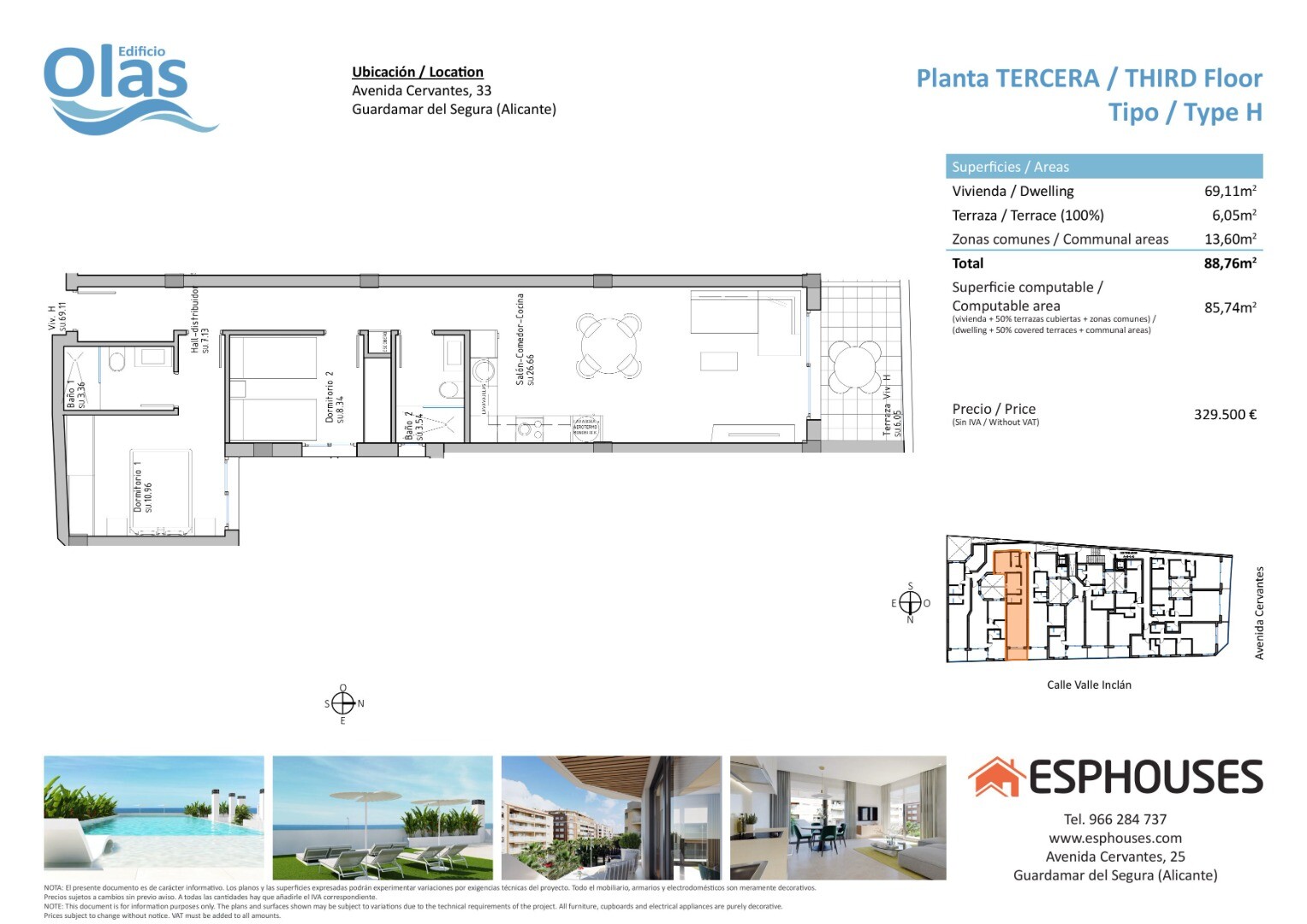 Situat într-o locație căutată în Guardamar del Segura, pe populara Avenida de Cervantes, veți găsi Edificio Olas, o alegere perfectă datorită apropierii sale de plajă și de o gamă largă de facilități. Această clădire specială va oferi o piscină și o terasă pe acoperiș, oferind cadrul ideal pentru a vă bucura de soare și a vă relaxa. Apartamentul în... cauză va avea două dormitoare, două băi, un living cu zonă de luat masa și o bucătărie integrată, precum și o terasă minunată. Suprafața construită a apartamentului este de 85,74 metri pătrați, iar terasa este de 6,05 metri pătrați, oferind un spațiu confortabil și primitor. Pe lângă designul său atractiv, apartamentul va fi dotat cu aer condiționat și facilități de automatizare a locuinței, oferind un control eficient și convenabil al diferitelor aspecte ale locuinței. Bucătăria va fi dotată cu aparate de înaltă calitate, inclusiv cuptor, mașină de spălat vase, frigider-congelator, hotă și plită cu inducție, asigurând funcționalitate și stil. Ca un bonus suplimentar, există posibilitatea de a achiziționa un loc de parcare și o cameră de depozitare în clădirea însăși, ceea ce facilitează depozitarea în siguranță a bunurilor și oferă confortul de a avea propriul loc de parcare. Edificio Olas se prezintă ca o oportunitate unică de a vă bucura de o viață confortabilă și convenabilă într-una dintre cele mai dorite zone din Guardamar del Segura. Locația sa privilegiată, împreună cu caracteristicile și beneficiile apartamentului, fac din acesta o alegere ideală pentru cei care caută o casă modernă și elegantă într-un cadru de coastă.