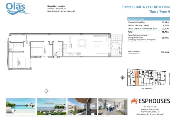 Situat într-una dintre cele mai căutate zone din Guardamar del Segura, pe Avenida de Cervantes, Edificio Olas va fi o alegere perfectă datorită locației sale privilegiate, aproape de plajă și de o mare varietate de servicii. Această clădire modernă va oferi rezidenților săi o experiență de viață excepțională, combinând confortul, stilul și împrejur...imile de coastă. Acest apartament disponibil în această clădire va fi compus din 2 dormitoare, 2 băi, un living-sufragerie spațios cu o bucătărie integrată și o terasă frumoasă. Cu o suprafață construită de 85,74 metri pătrați și o suprafață de terasă de 6,05 metri pătrați, acest spațiu oferă spațialitate și confort pentru întreaga familie. Finisajele și caracteristicile acestui apartament vor fi de înaltă calitate. Acesta va fi dotat cu instalație de aer condiționat, care va garanta o atmosferă răcoroasă și plăcută pe tot parcursul anului. În plus, sistemul integrat de automatizare a locuinței permite un control inteligent și convenabil al diferitelor funcții din casă, oferind un confort și o eficiență energetică sporită. Bucătăria, proiectată cu stil și funcționalitate, va fi dotată cu aparate de calitate superioară, inclusiv cuptor, mașină de spălat vase, frigider-congelator, hotă și plită cu inducție. Pregătirea unor mese delicioase va fi o plăcere în acest spațiu bine echipat. Edificio Olas oferă, de asemenea, opțiunea de a achiziționa un loc de parcare și o cameră de depozitare în aceeași clădire, ceea ce oferă un plus de confort și siguranță pentru rezidenții săi. Astfel, nu vor exista griji legate de parcare sau de depozitarea bunurilor suplimentare. Pe lângă facilitățile interne, clădirea va dispune de o minunată piscină pe acoperiș, unde rezidenții se vor putea bucura de scufundări răcoritoare și momente de relaxare la soare. Pe scurt, Edificio Olas din Guardamar del Segura este o oportunitate unică de a achiziționa un apartament contemporan într-o locație imbatabilă. Cu un design modern, dotări de înaltă calitate și apropierea de plajă și de servicii, acest loc promite să ofere o viață confortabilă și plină de momente de neuitat pe frumoasa coastă mediteraneană.