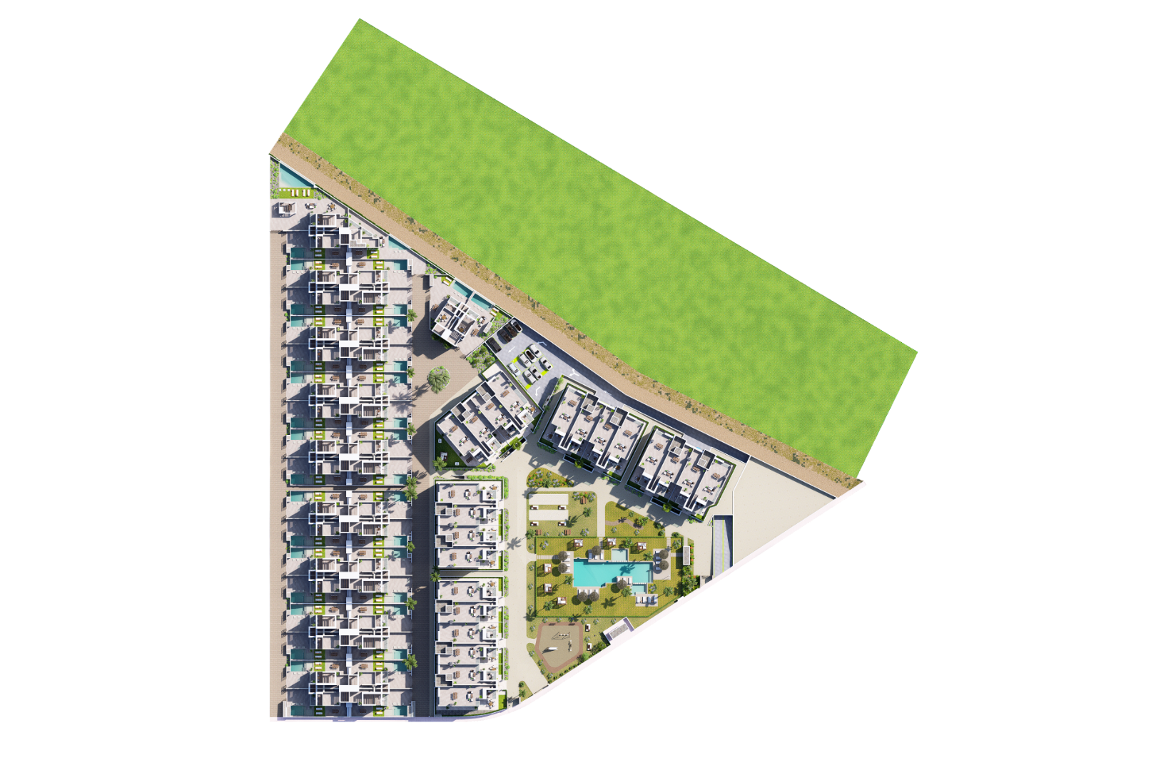 Complexul rezidențial oferă zone comune excelente, inclusiv o piscină centrală tip plajă, paturi balineze, zonă de jacuzzi, piscină pentru copii, două terenuri de petanque, loc de joacă pentru copii, sală de fitness și zonă spa cu saună.