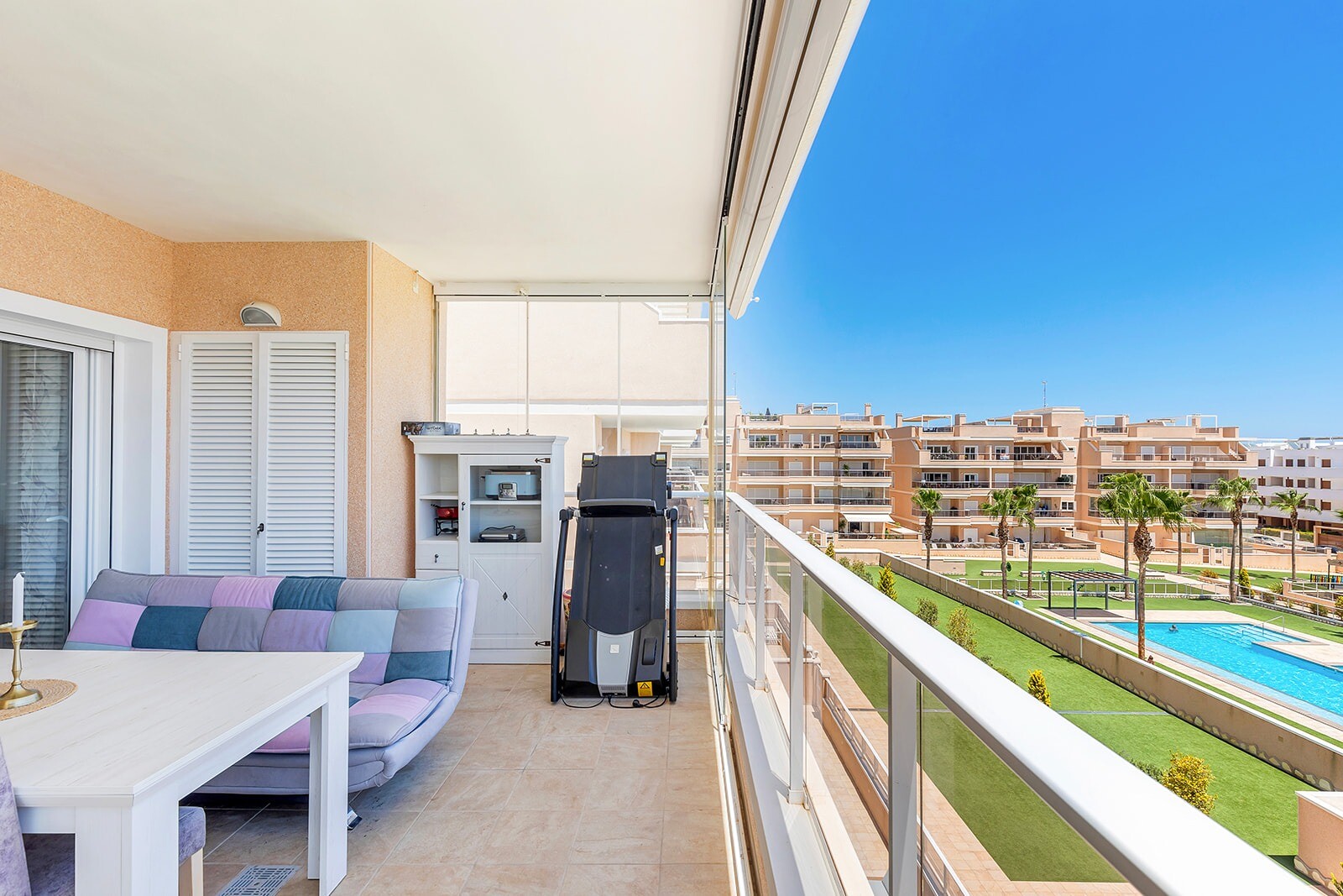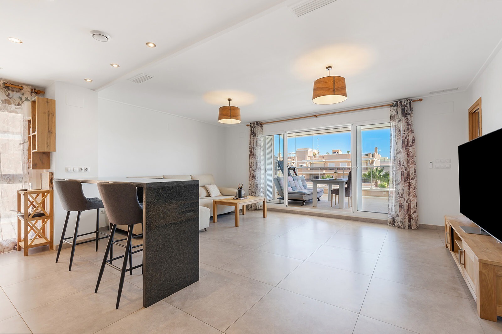 Acest apartament frumos are trei dormitoare, dintre care unul are o baie privată și acces direct la terasa cu vedere la grădina comună și la piscină. Un living spațios cu bucătărie deschisă și acces direct la terasa de 16 m2.