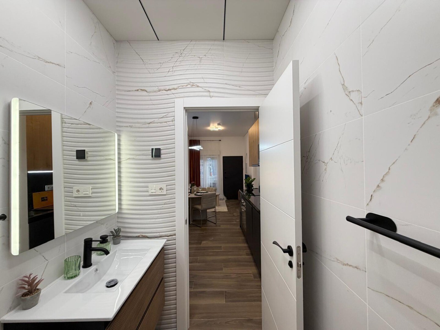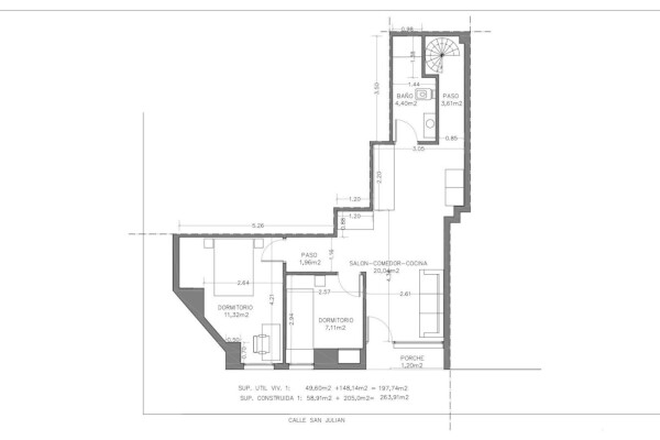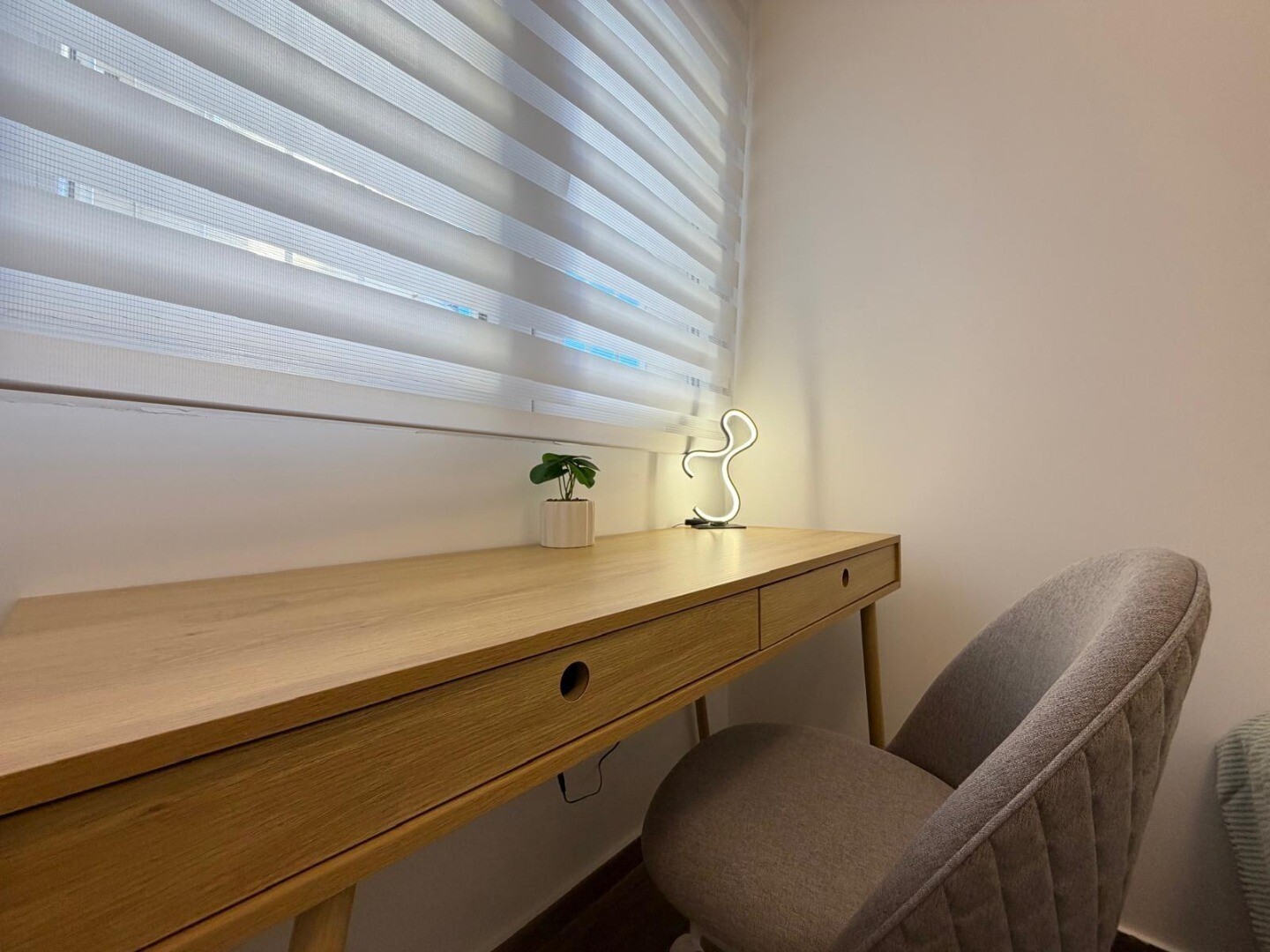 Locuința are 59 m² construiți și include două dormitoare cu dulapuri încorporate, o baie și un living luminos cu bucătărie open-space.