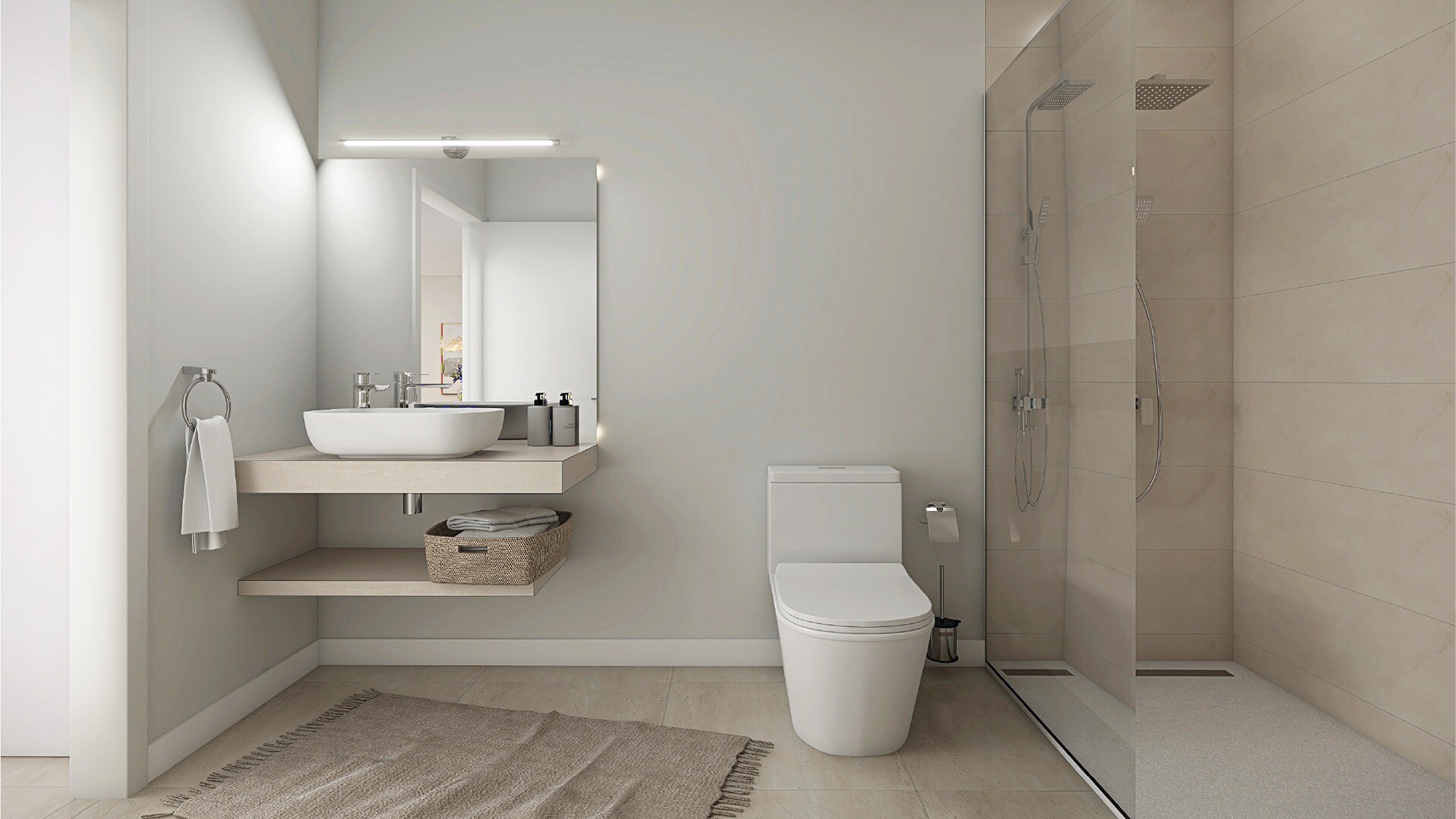 Locuința dispune de 2 dormitoare cu dulapuri încorporate și 2 băi. Livingul cu bucătărie deschisă echipată cu electrocasnice oferă un spațiu modern și luminos.