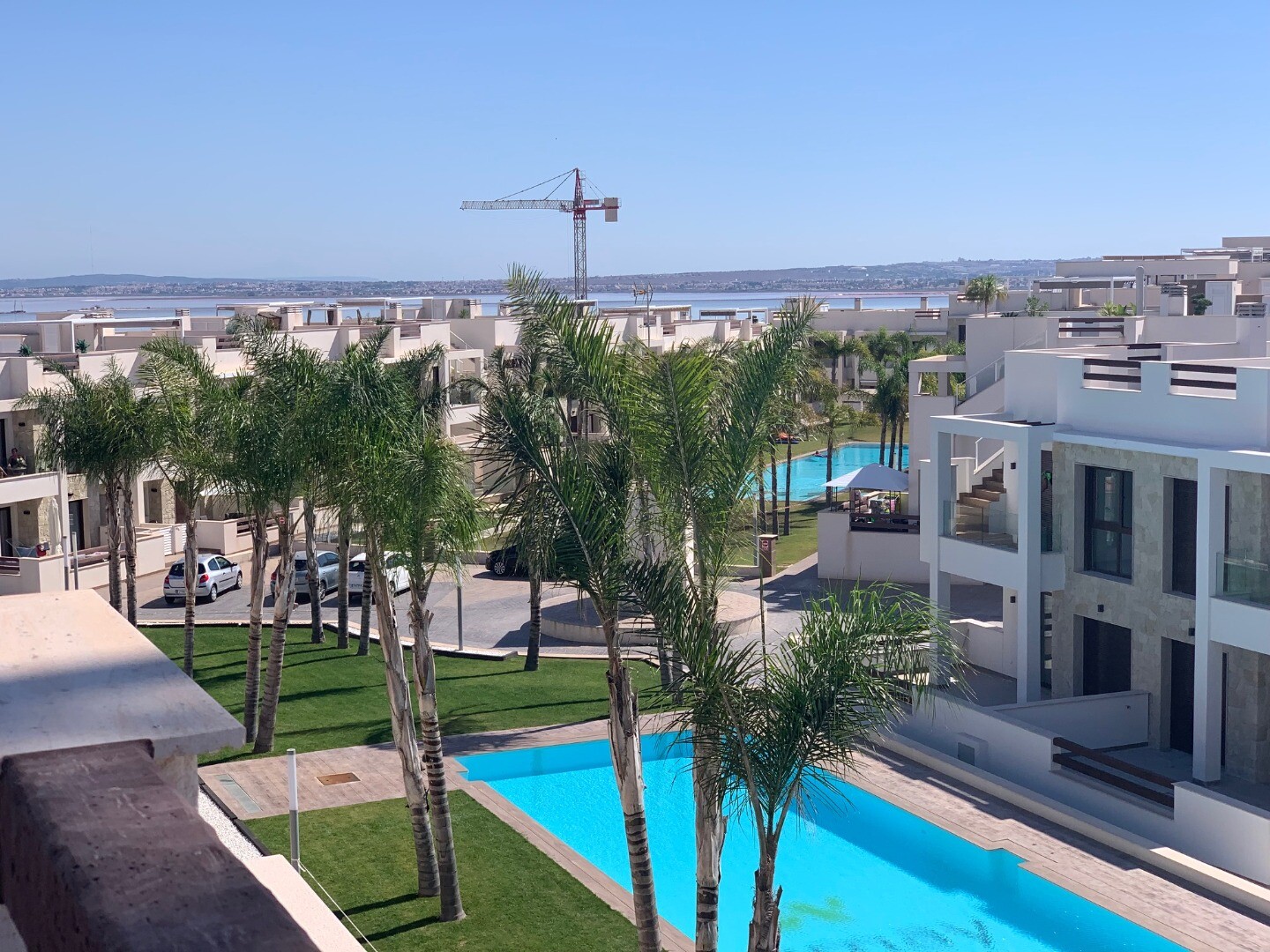 Din solar aveți o vedere frumoasă asupra lacului sărat roz din Torrevieja, precum și o mică vedere la mare. Balconul are vedere la grădina comună și la piscină.