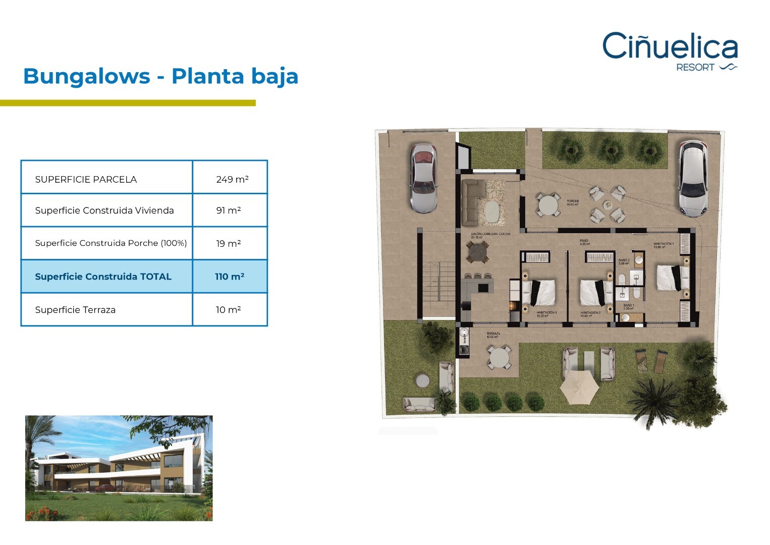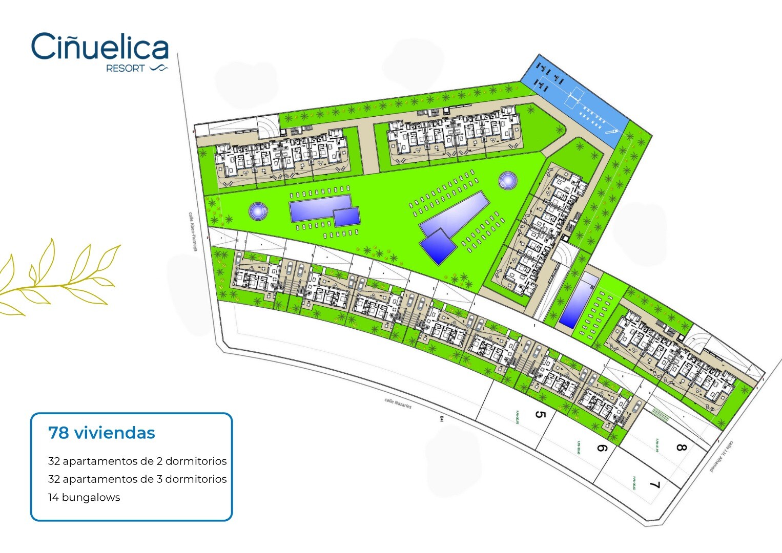 Stațiunea La Cinuelica este o reședință formată din 4 blocuri de apartamente cu un total de 32 de apartamente cu 2 dormitoare, 32 de apartamente cu 3 dormitoare și 14 bungalouri cu 3 dormitoare. Apartamentele sunt prevazute cu loc de parcare subteran si camera de depozitare, electrocasnice de bucatarie (combinatie frigider-congelator, plita ceramic...a, cuptor, cuptor cu microunde, masina de spalat vase, masina de spalat rufe si hota), obloane electrice, boiler de apa aerotermala, preinstalare A/C prin conducte de aer si pentru solarii de acoperis preinstalare pentru bucatarie exterioara si Jaccuzi. Zonele comune includ grădini amenajate cu 3 piscine și 2 jacuzzi încălzite, o zonă de fitness în aer liber și un loc de joacă. Reședința este situată la 1000m de plaja Punta Prima și la 500m de centrele comerciale cu supermarket, baruri, restaurante, bancomate, magazine etc.