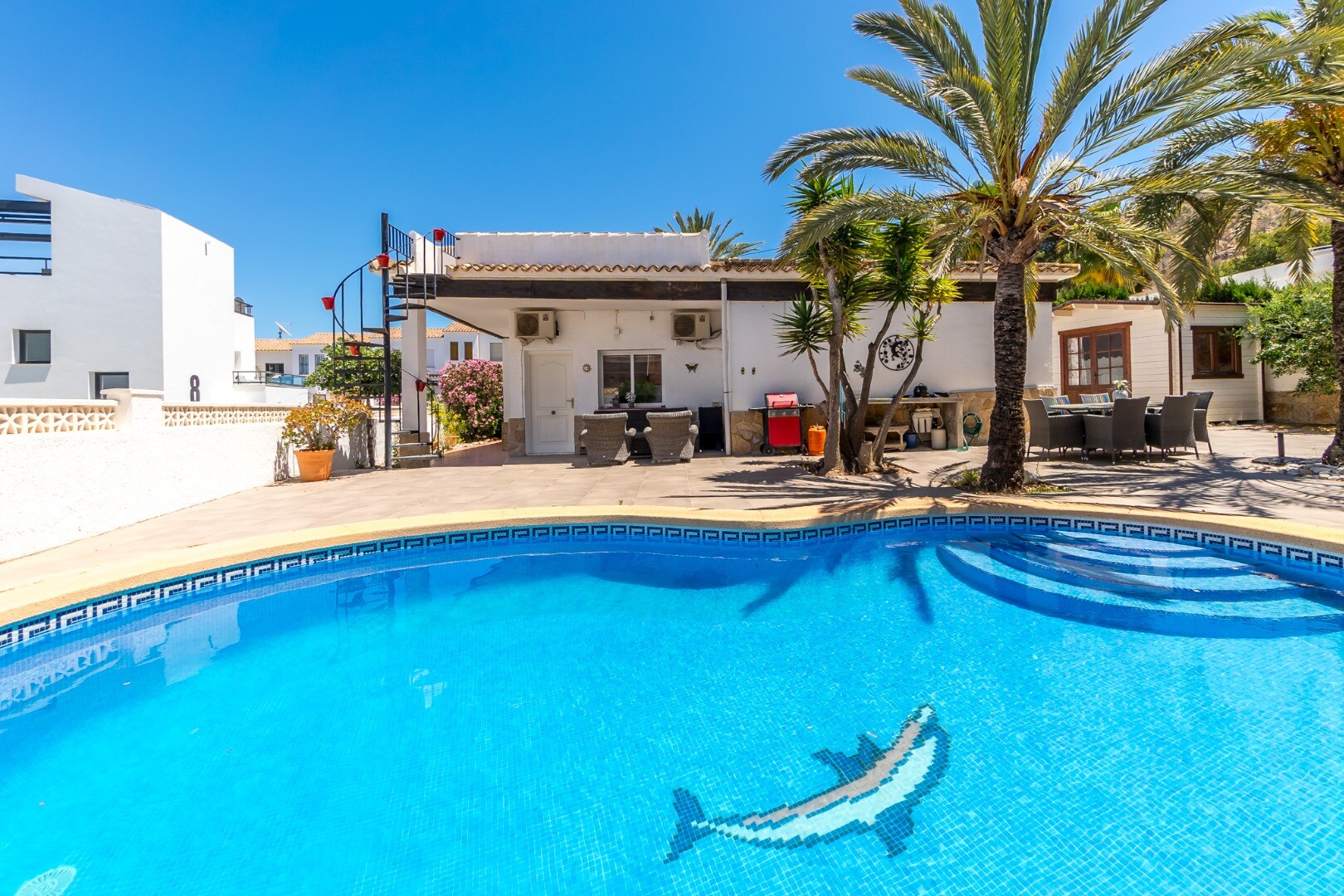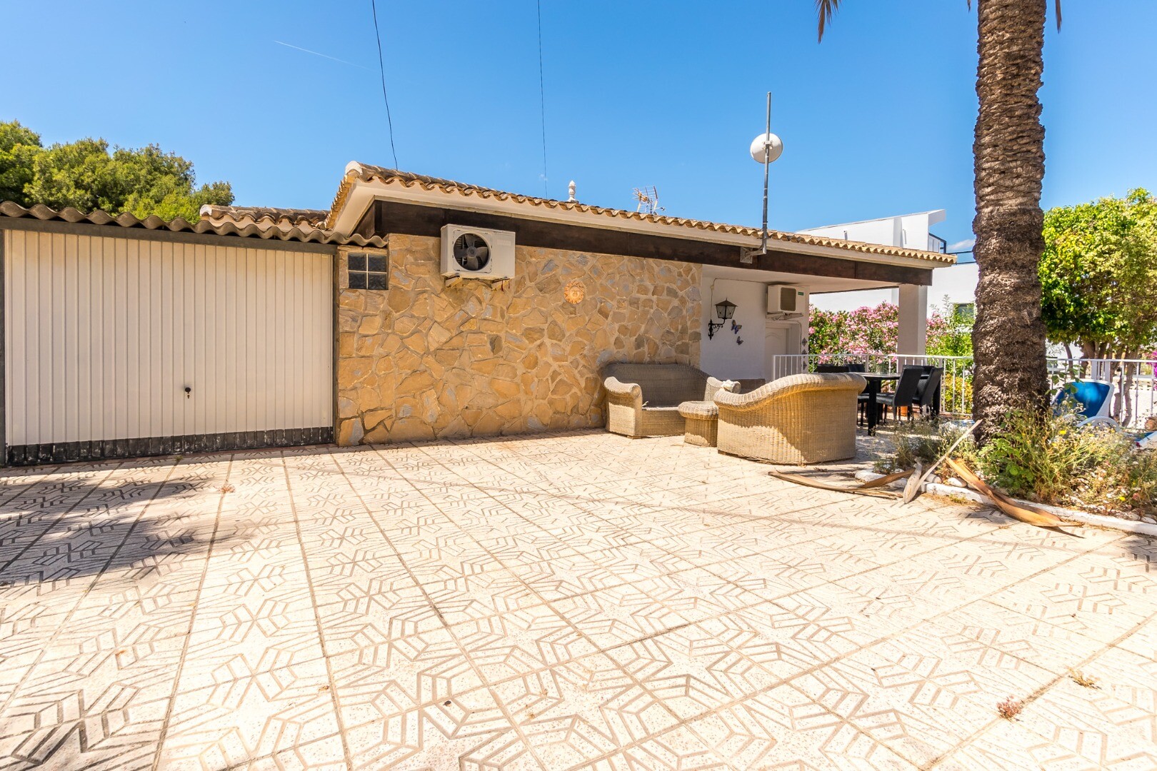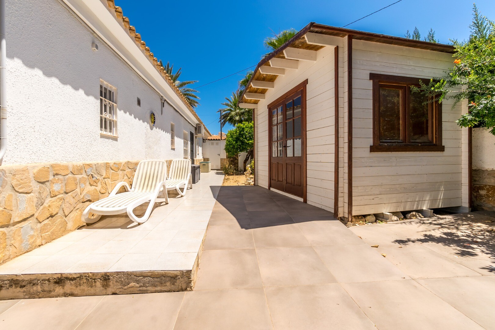Situată pe un teren însorit de 600 m², orientat spre sud, într-o liniștită stradă rezidențială închisă, această excepțională vilă mediteraneană oferă intimitate, confort și o versatilitate remarcabilă, la doar 900 de metri de plajă și la 600 de metri de magazine, supermarketuri și transport public.
