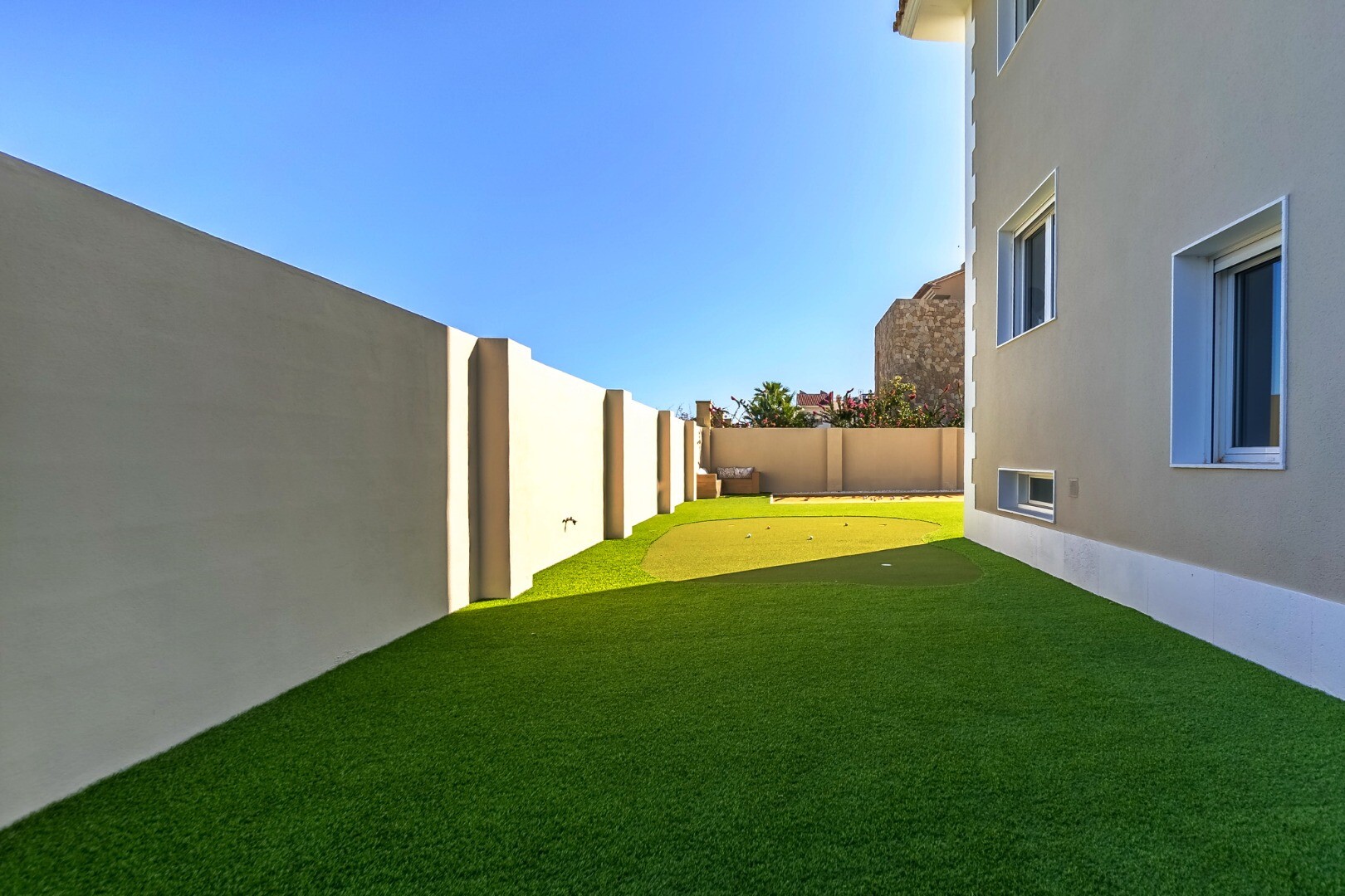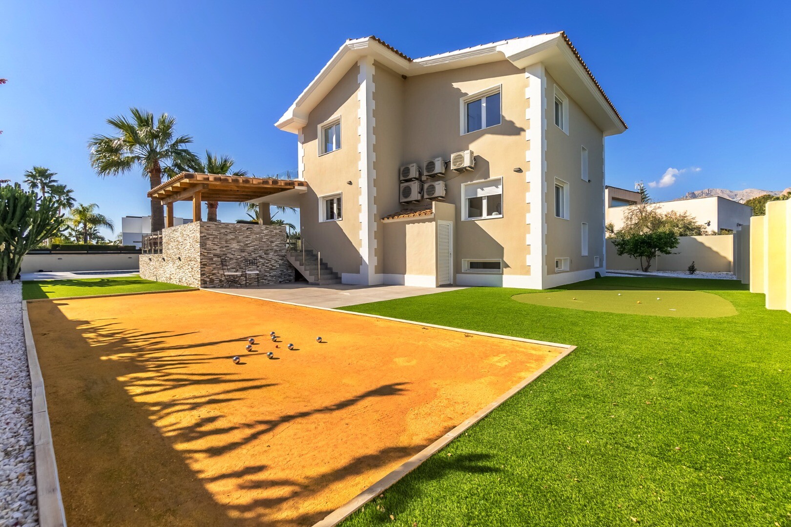 În exterior veți găsi grădini amenajate, bucătărie exterioară cu grătar, zonă de relaxare cu pergolă, piscină iluminată de 11×5 m, teren de pétanque și teren de minigolf privat.