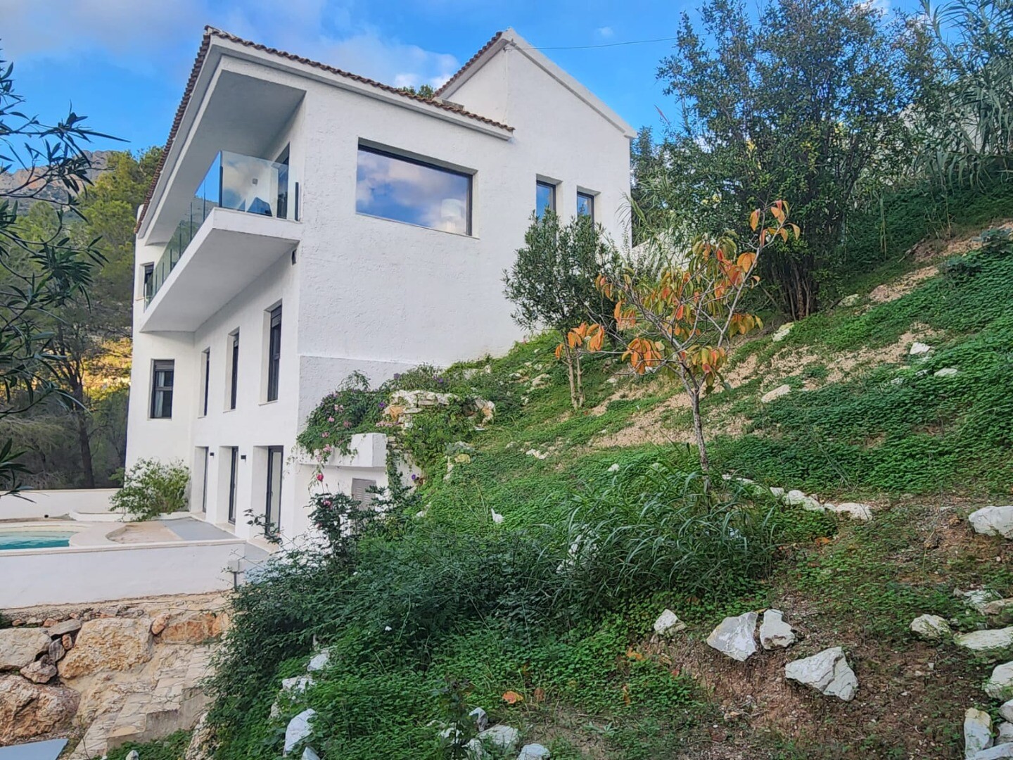 Situată într-o zonă rezidențială foarte liniștită și privată, această vilă amplasată pe un versant de munte oferă priveliști spectaculoase asupra orizontului orașului Altea, a mării și a munților din jur. Proprietatea este distribuită pe trei etaje care profită din plin de panta naturală a terenului, asigurând intimitate, lumină naturală și o conexiune constantă cu împrejurimile.