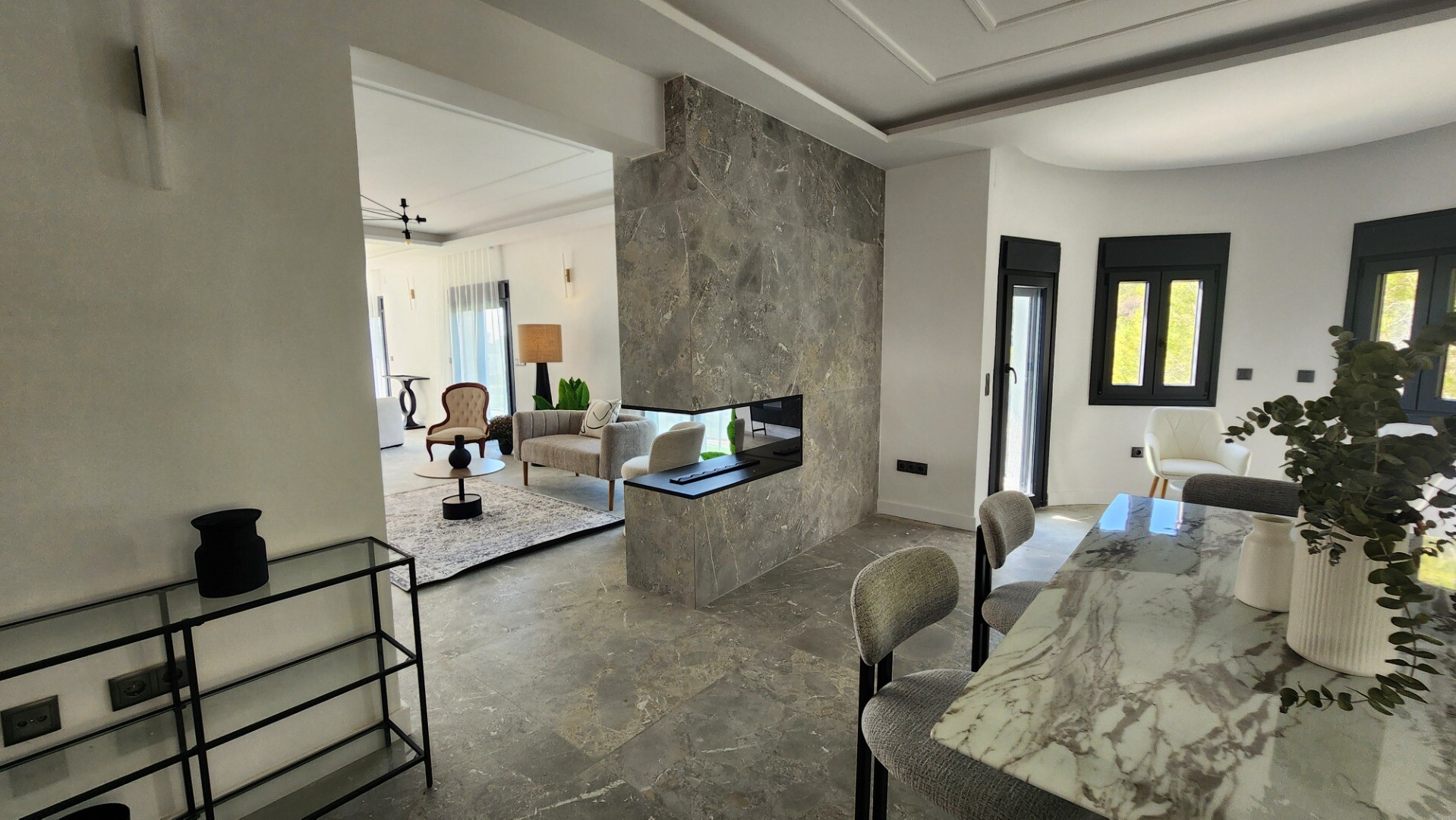Din stradă, intrați într-o zonă pavată spațioasă, cu spațiu pentru mai multe vehicule și o alee amenajată care duce la holul principal de la intrare. La acest etaj, veți găsi o bucătărie open space mare, complet utilată, un living-sufragerie cu zone distincte (living, sufragerie, zonă TV, șemineu) și o senzație de spațiu sporită de priveliștile nesfârșite de la ferestrele panoramice. Acest etaj include, de asemenea, o toaletă pentru oaspeți și un lift.