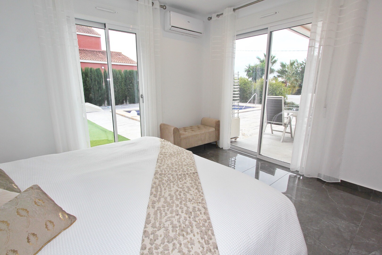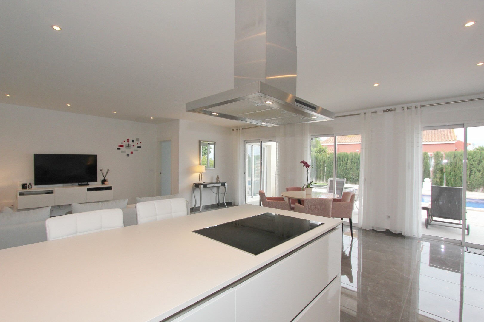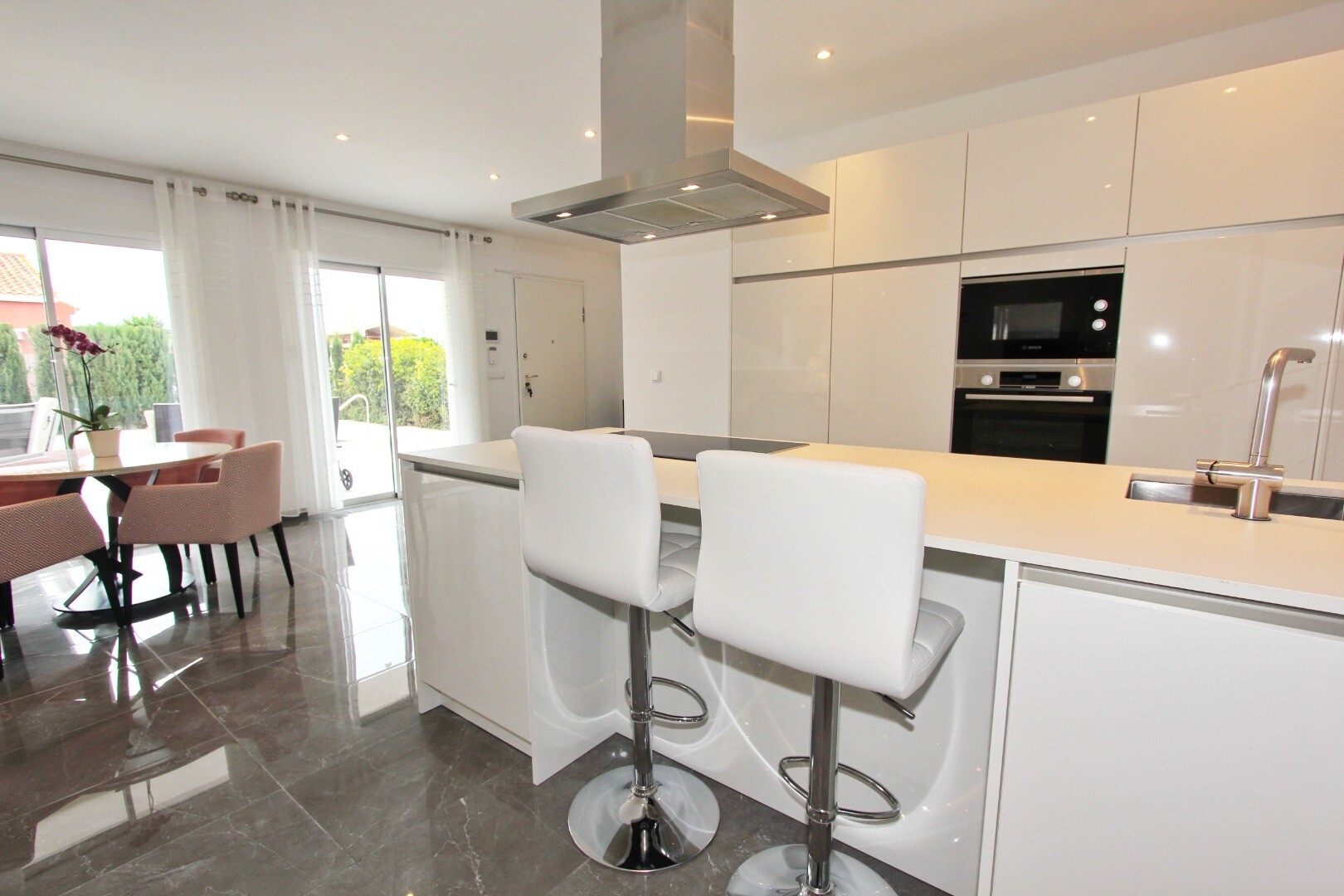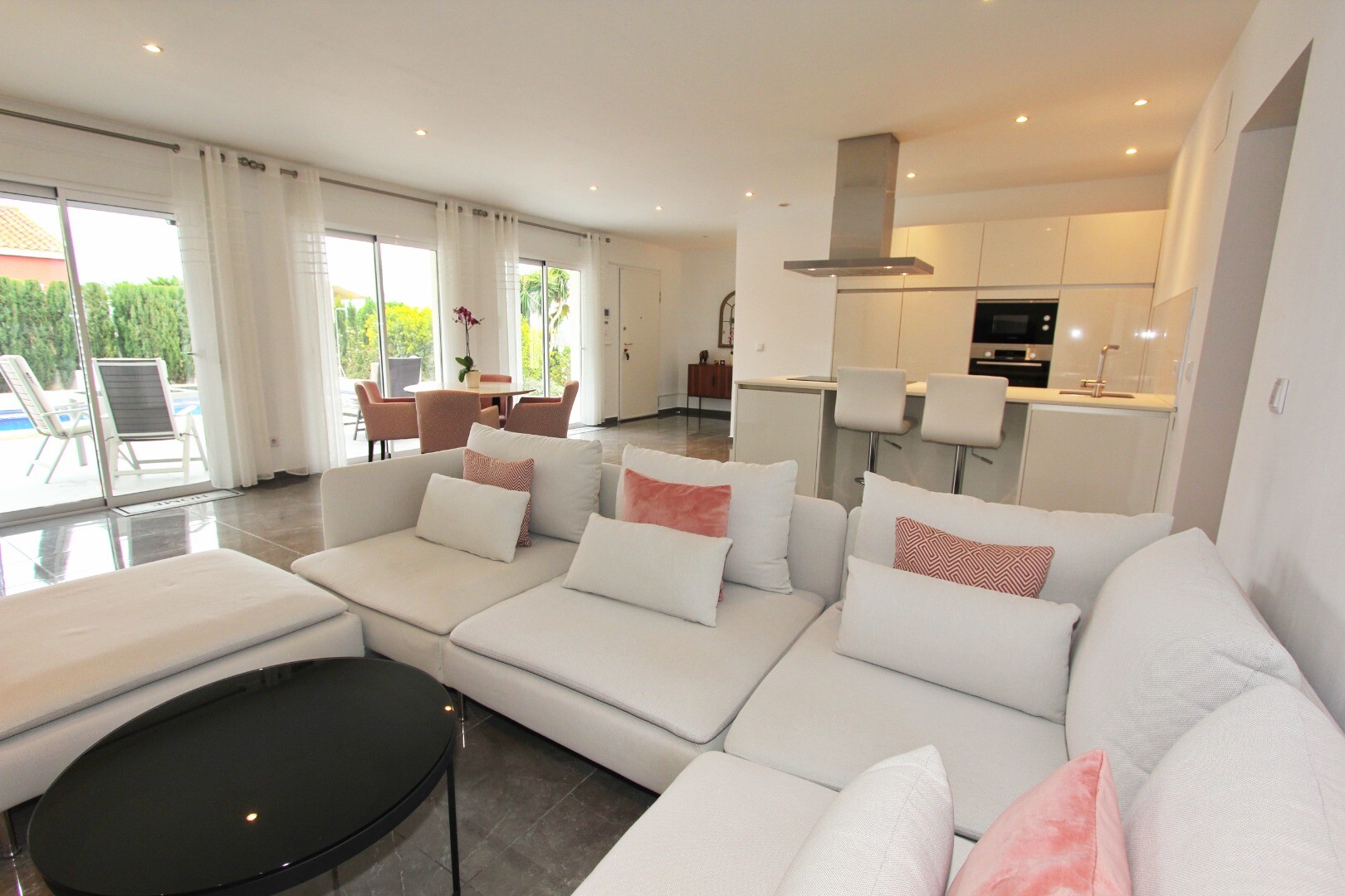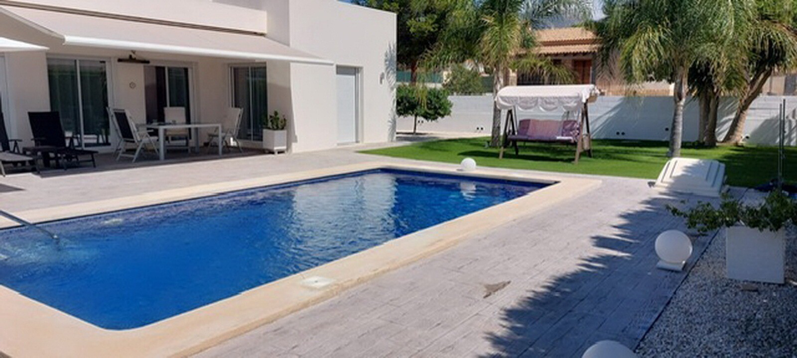 Bun venit în sanctuarul tău rural! Această vilă elegantă pe un singur nivel se mândrește cu finisaje moderne elegante și cu o abundență de lumină naturală care dansează prin ferestrele generoase din podea până în tavan. Bucurați-vă de bucătăria gourmet, un refugiu pentru bucătari aspiranți, și savurați cafeaua de dimineață pe terasa privată de lâng...ă piscină, unde priveliștile asupra grădinii și a piscinei se desfășoară în fața ochilor dumneavoastră. Amplasată într-un cătun rural, această vilă privată este poarta ta către un stil de viață liniștit, înconjurată de propria ta grădină mare, cu vegetație luxuriantă și pomi fructiferi, un loc ideal pentru a lua masa în aer liber sau a savura cocktailuri lângă piscină! Orașul Mutxamel este la doar 7 minute de mers cu mașina, iar plaja la 10 minute. Mutxamel și Busot au un sentiment de „sat spaniol” și se mândresc cu multe magazine locale de artizanat, supermarketuri de marcă și piețe săptămânale de fructe și legume!