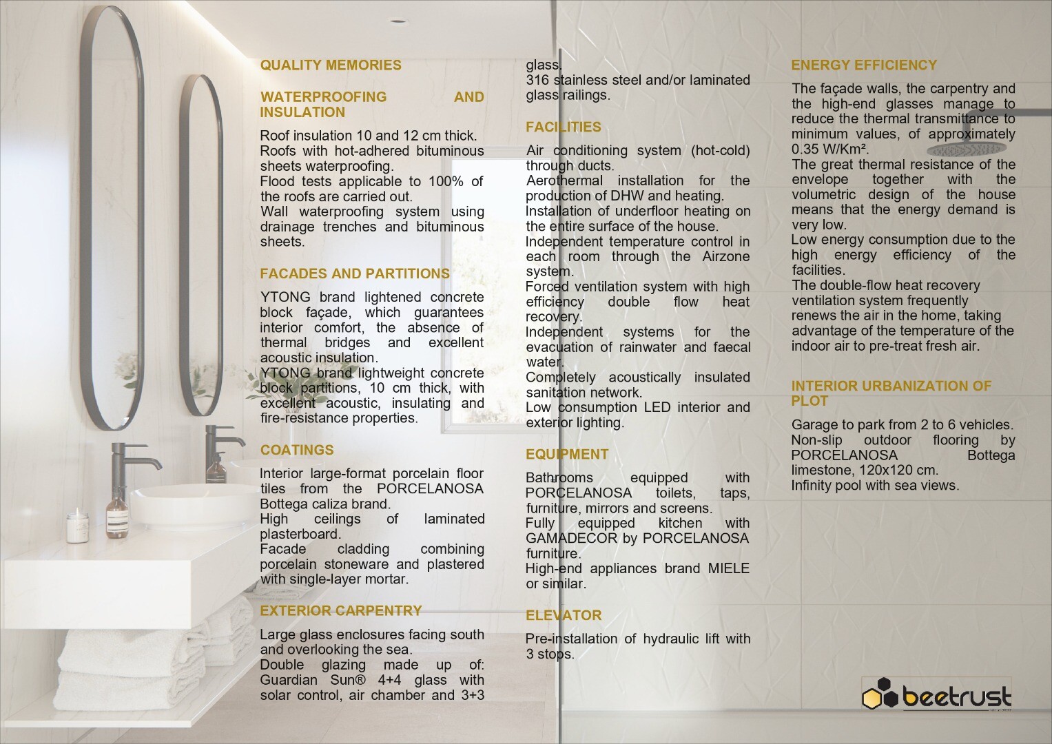 În aceste case sunt folosite doar materiale de cea mai bună calitate și design exclusiv. Senzatia in interior este foarte s...patioasa datorita ferestrelor orientate spre mare si a tavanelor inalte, cu doua spatii cu inaltime dubla in hol si living-sufragerie care permite circulatia libera a luminii naturale in intreaga vila.