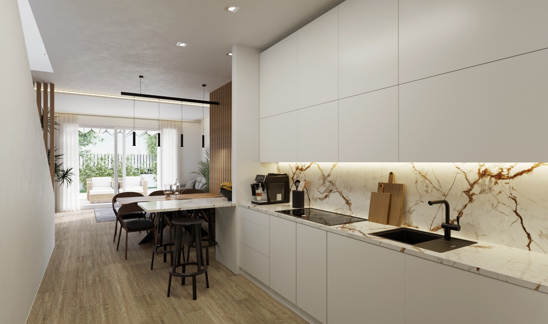 aer vara. Acest lucru are ca rezultat economii semnificative de energie, asigurând în același timp că aerul care intră în casă este curat și filtrat. Sistem aerotermal de apă caldă menajeră. La fel cum energia geotermală folosește căldura din subteran pentru a genera energie, energia aerotermală folosește calorii din aerul exterior, generând încălzire și apă caldă iarna și răcire vara, la costuri foarte mici. O pompă de căldură instalată pe acoperiș captează aerul printr-un gaz frigorific și îl trimite în interiorul casei. Funcționează și invers: extrage căldura din interior pentru a genera aer rece. Instalarea panourilor fotovoltaice pe acoperiș pentru economisirea energiei. Panourile solare fotovoltaice captează energia din radiația solară și o transformă în energie electrică. Sistemul dispune de invertoare care convertesc energia generata de panouri din curent continuu in curent alternativ pentru utilizare in casa. Panourile fotovoltaice asigură economii semnificative la facturile de energie electrică reducând în același timp amprenta ecologică, toate cu costuri reduse de întreținere. Aeroportul Alicante este accesibil în 25 de minute.