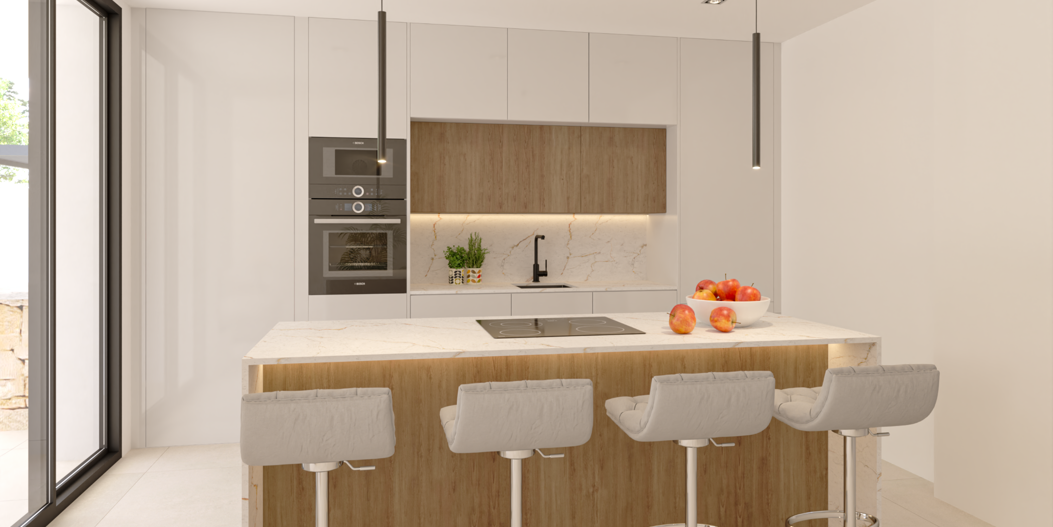 Parterul confortabil și primitor oferă o suprafață utilă generoasă de 178,50 m², atent proiectată pentru a oferi un trai zilnic confortabil. Livingul-sufragerie spatios, urmat de bucatarie si o galerie, completeaza spatiul de zi, cu acces direct la zona de agrement si gradina, piscina si gratar. La etajul superior, cu o suprafață de 123,90 m², se află două dormitoare cu băi private și o terasă bioclimatică. În spate se află o terasă la soare proiectată ideal, cu balustradă de sticlă.