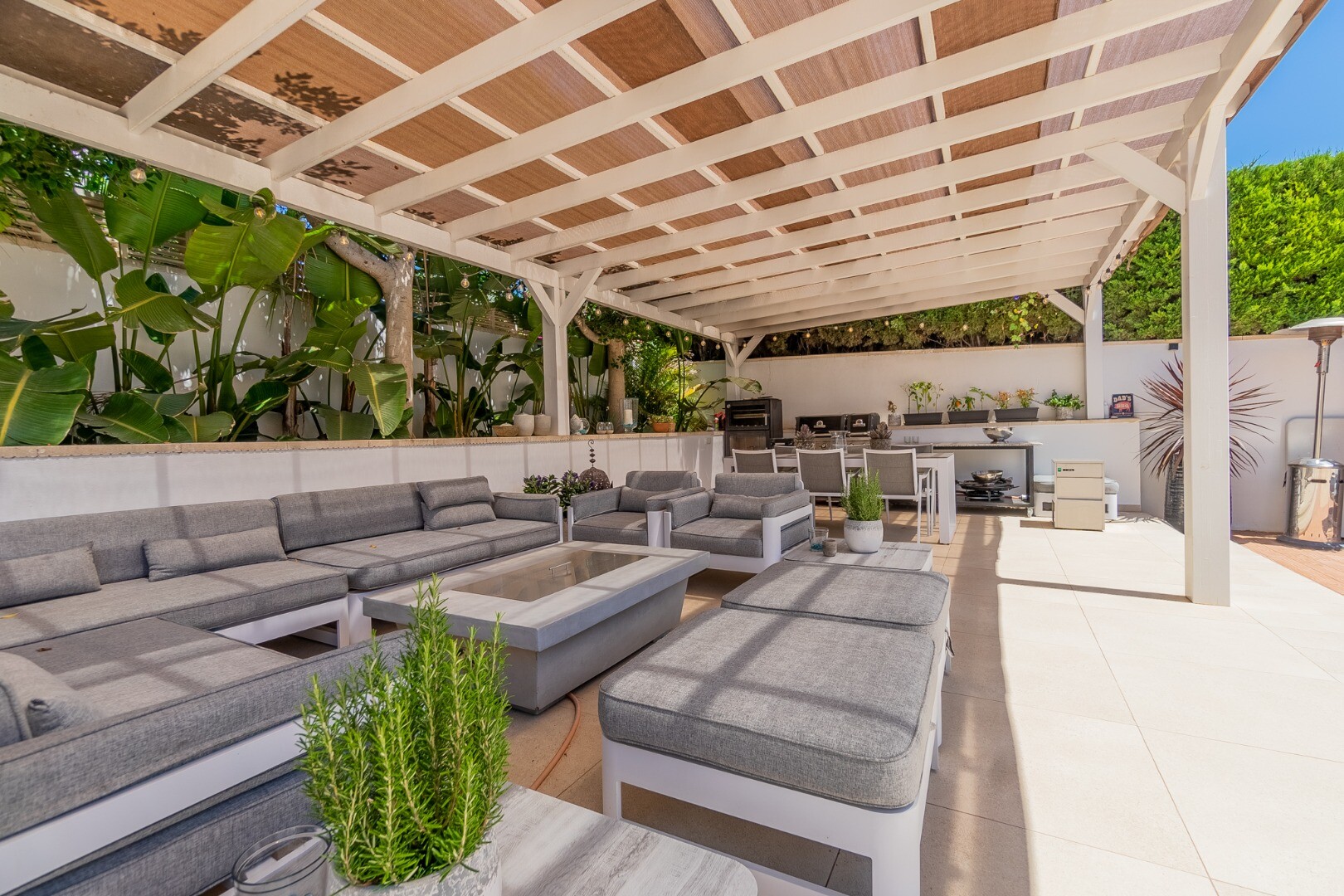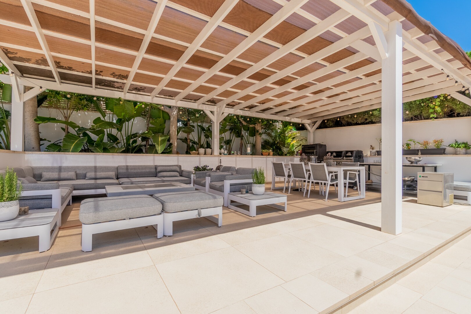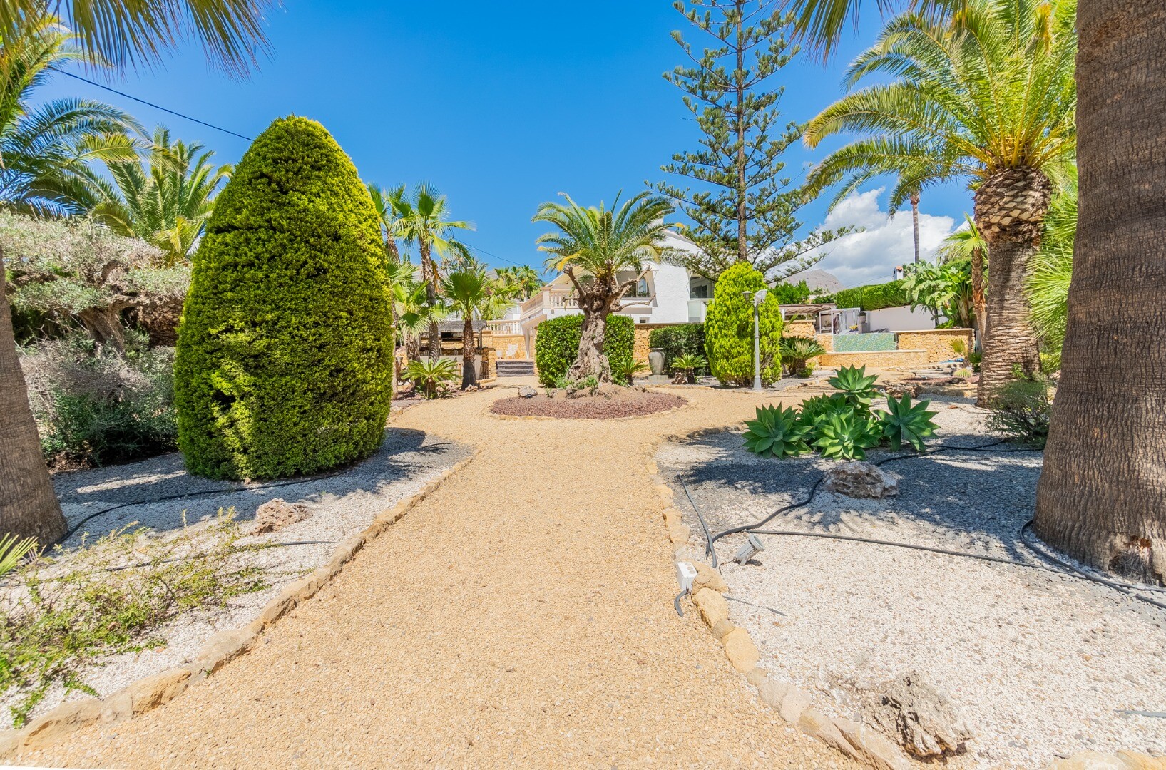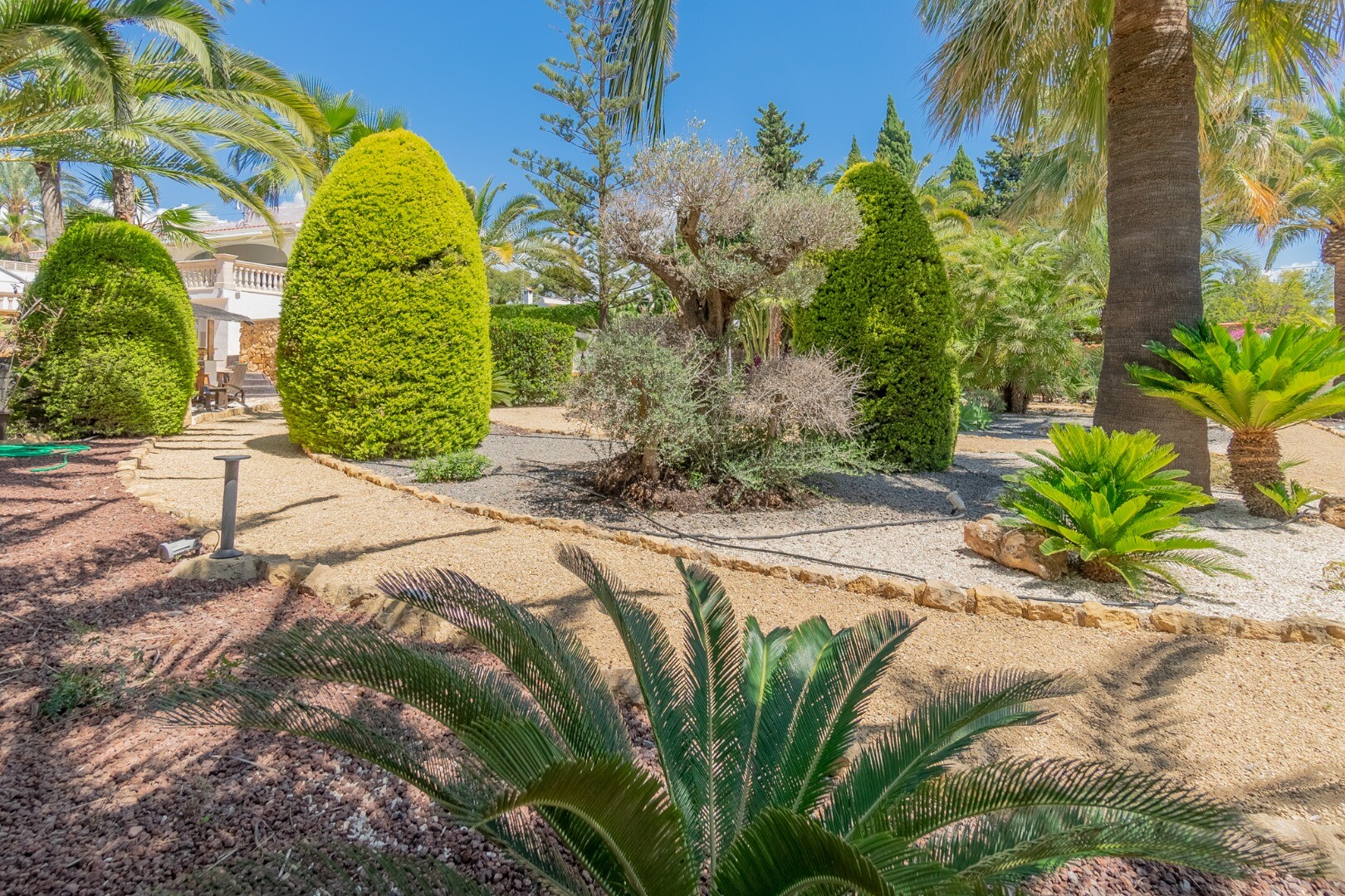 - **Grădina tropicală:** Situată pe parcela inferioară, grădina este un paradis tropical cu palmieri, iluminat nocturn, mai multe zone de relaxare și o zonă de bar cu sistem de sonorizare și iluminare integrată printre vegetația luxuriantă. Un jacuzzi cu nisip de plajă adaugă o notă exotică.