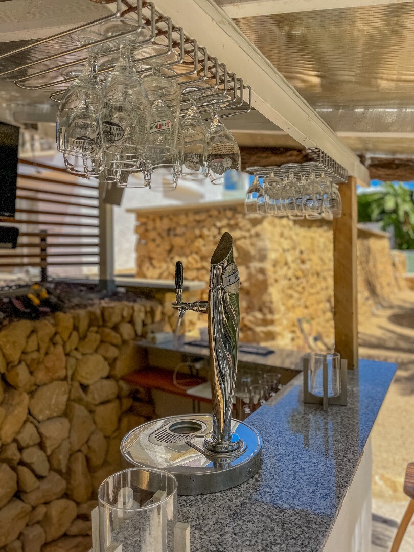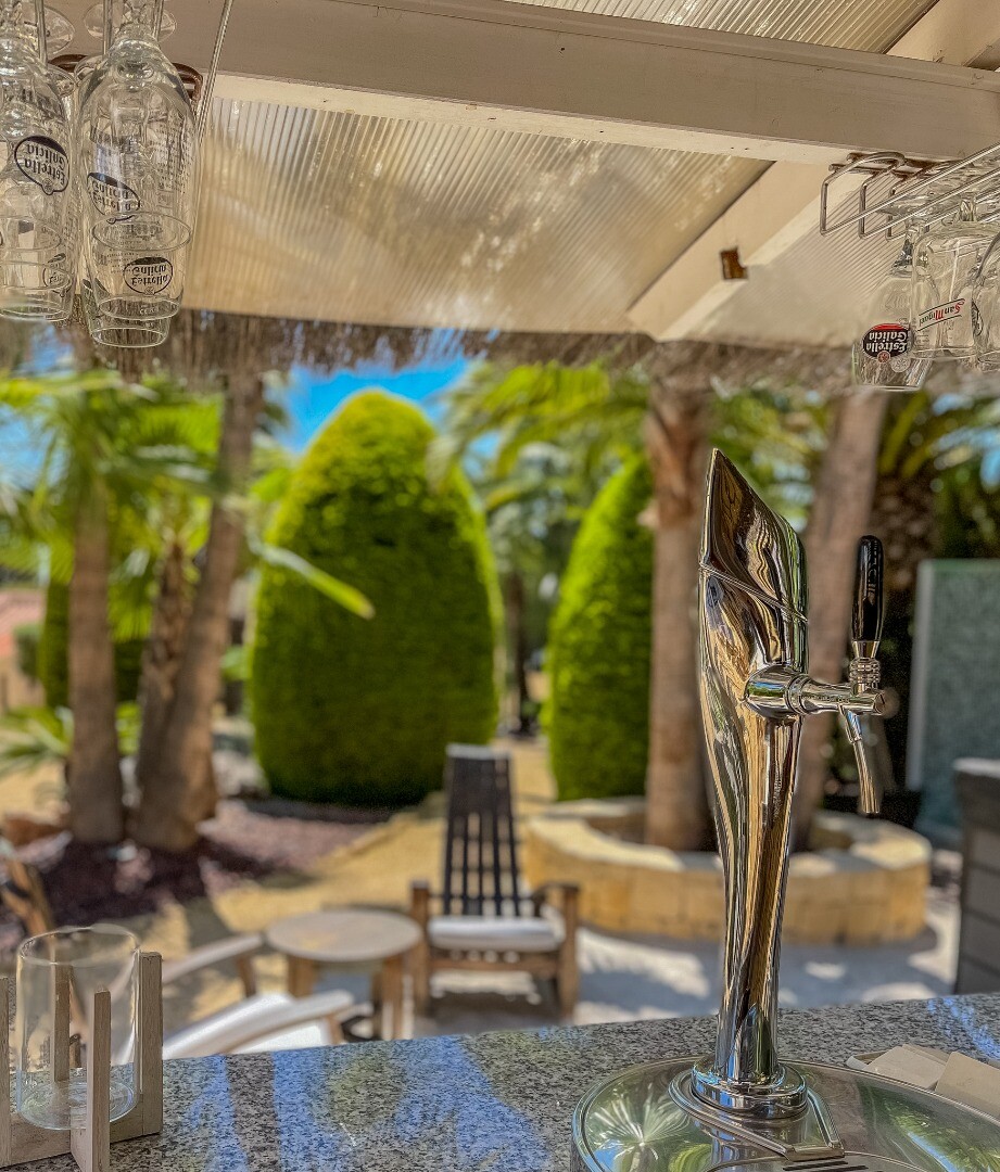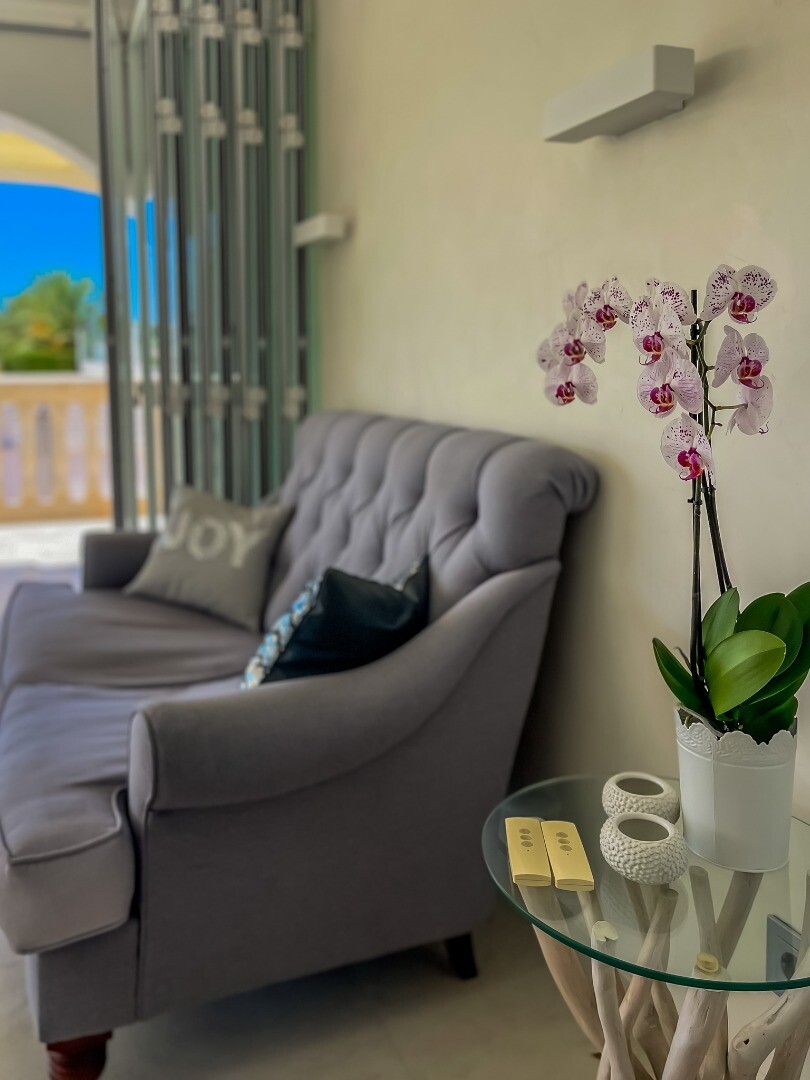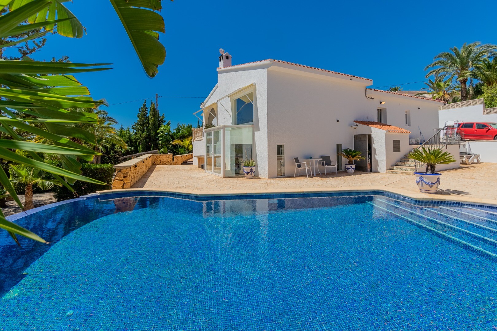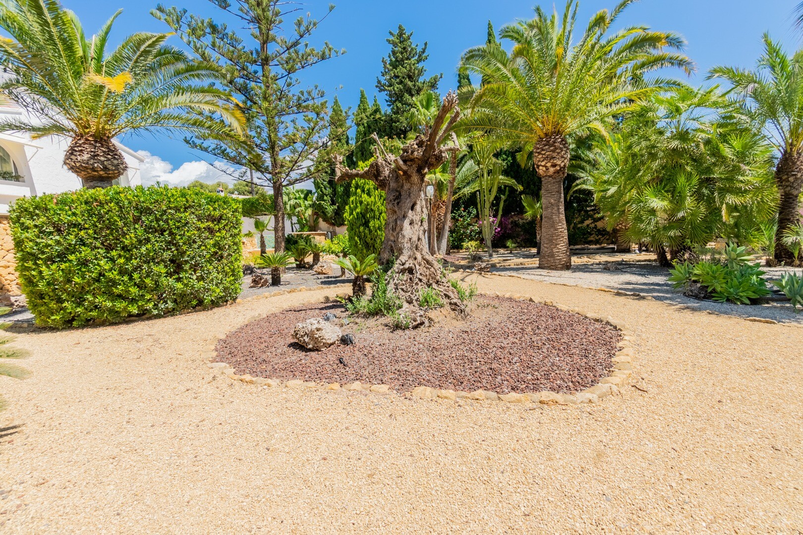 - **Grădina tropicală:** Situată pe parcela inferioară, grădina este un paradis tropical cu palmieri, iluminat nocturn, mai multe zone de relaxare și o zonă de bar cu sistem de sonorizare și iluminare integrată printre vegetația luxuriantă. Un jacuzzi cu nisip de plajă adaugă o notă exotică.