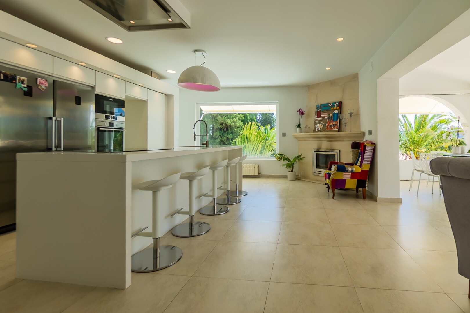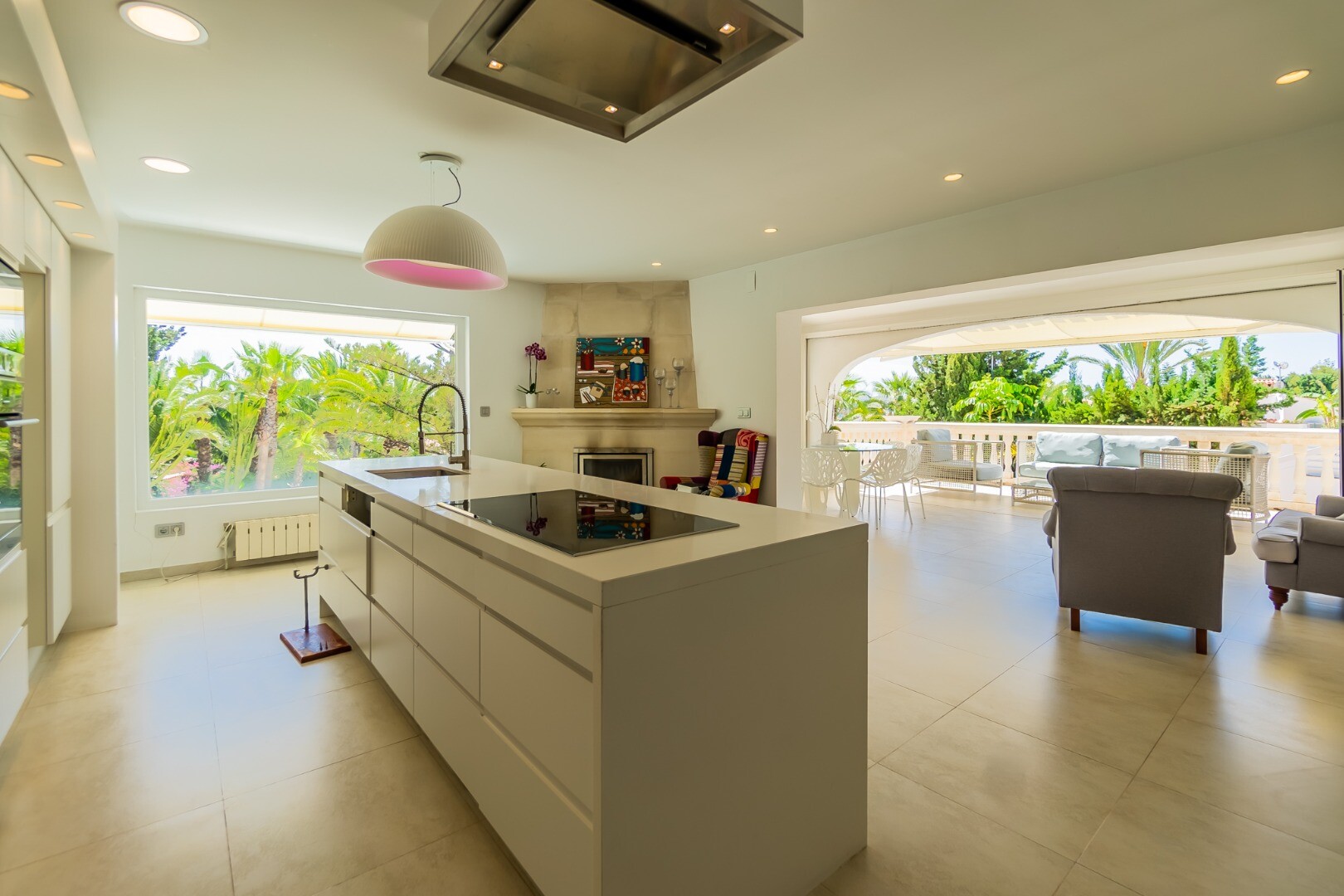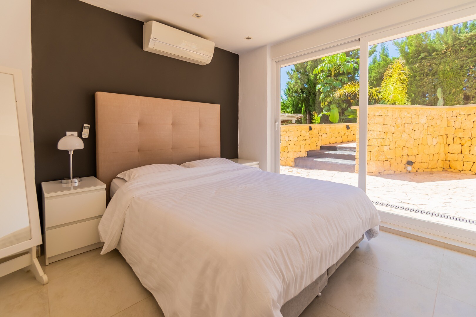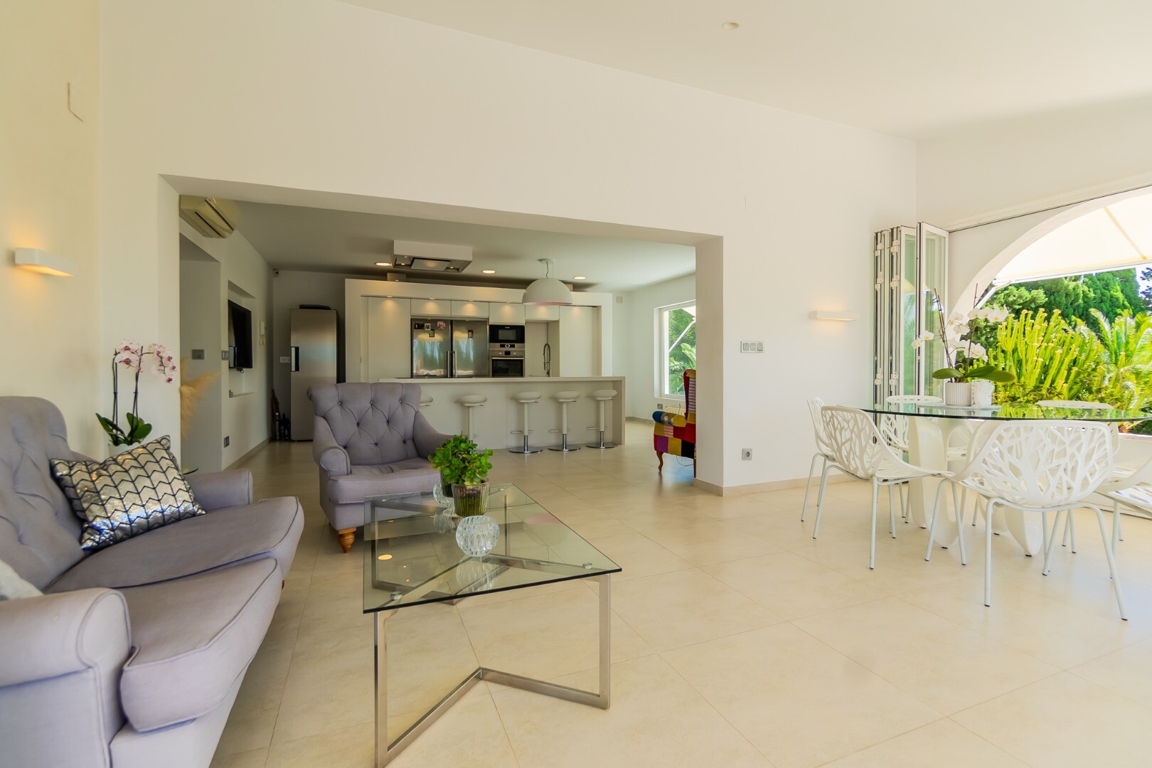 - **Grădina tropicală:** Situată pe parcela inferioară, grădina este un paradis tropical cu palmieri, iluminat nocturn, mai multe zone de relaxare și o zonă de bar cu sistem de sonorizare și iluminare integrată printre vegetația luxuriantă. Un jacuzzi cu nisip de plajă adaugă o notă exotică.