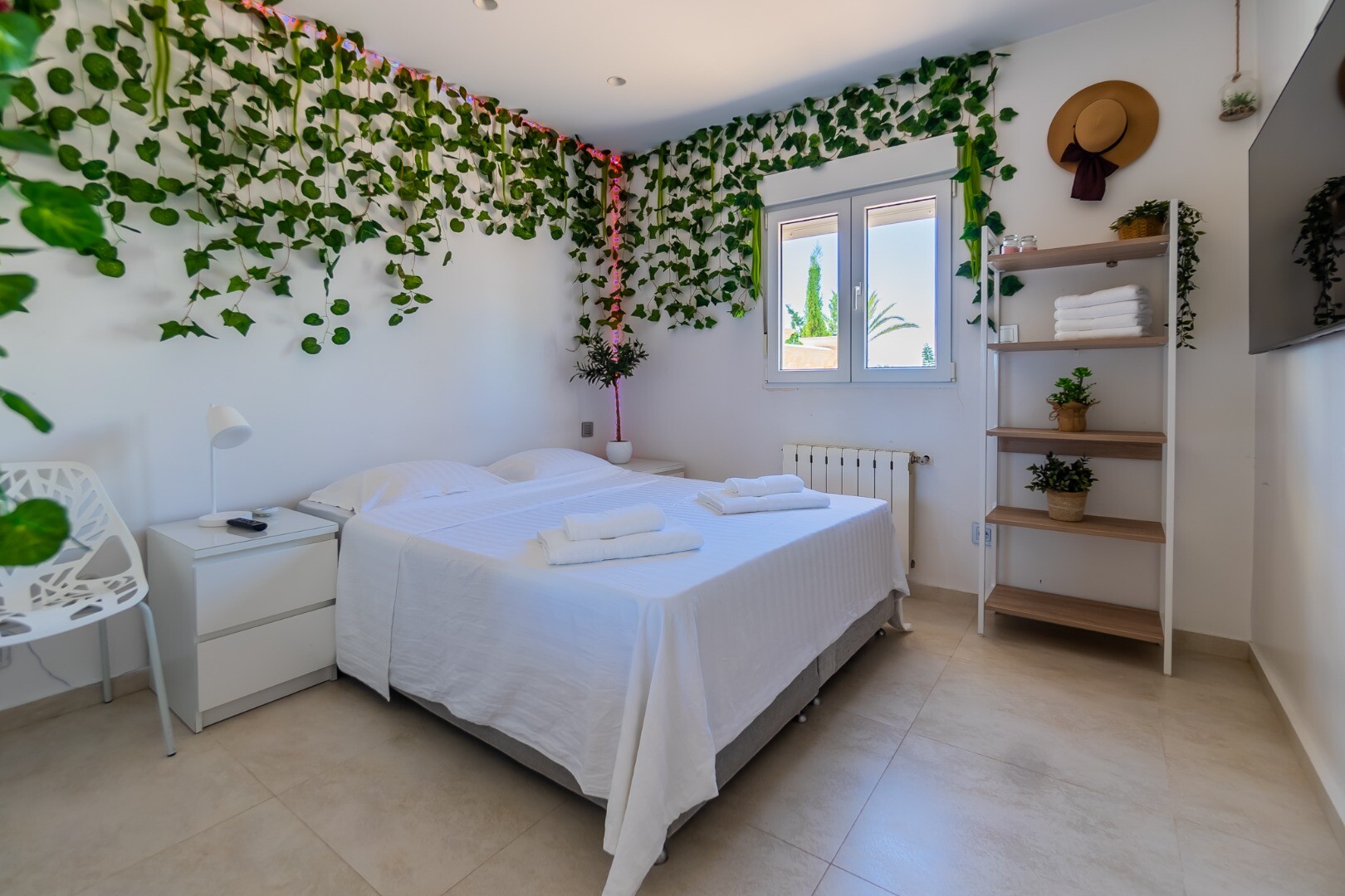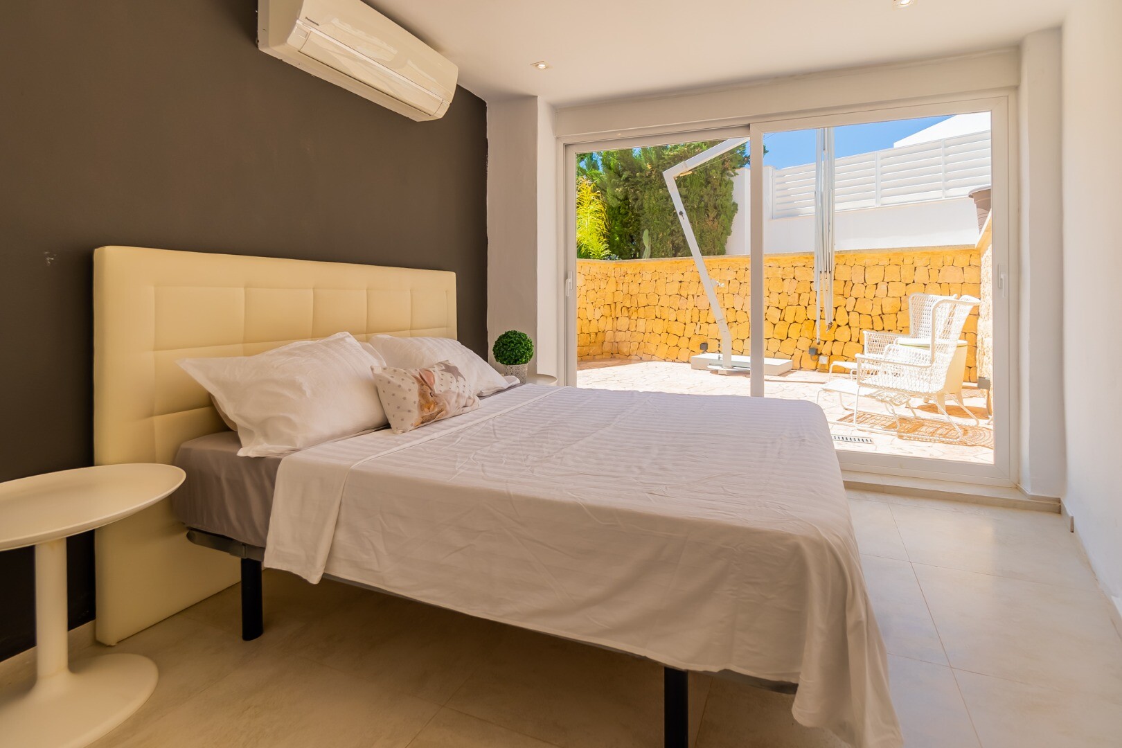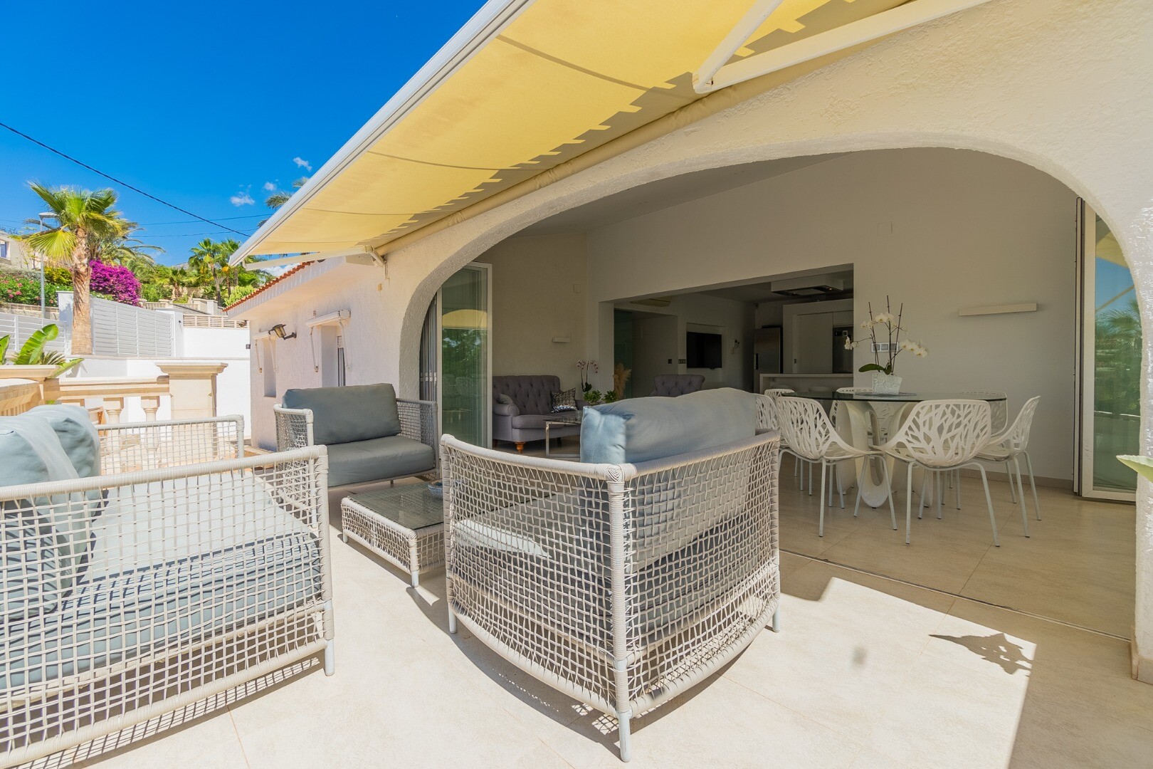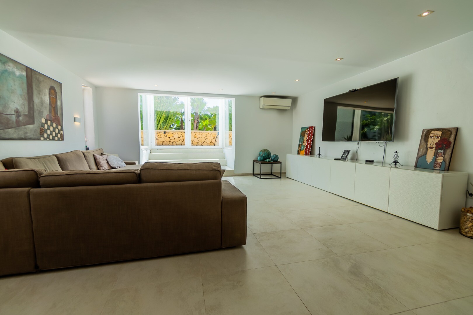 - **Grădina tropicală:** Situată pe parcela inferioară, grădina este un paradis tropical cu palmieri, iluminat nocturn, mai multe zone de relaxare și o zonă de bar cu sistem de sonorizare și iluminare integrată printre vegetația luxuriantă. Un jacuzzi cu nisip de plajă adaugă o notă exotică.