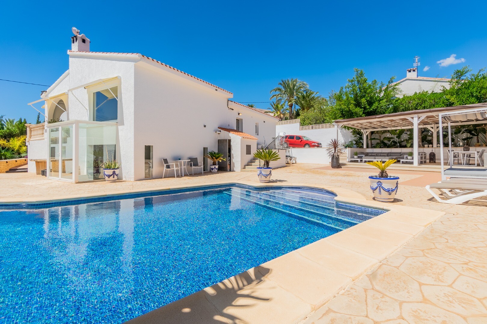 - **Zona de piscină:** O zonă de piscină privată și însorită cu beton imprimat, o pergolă de 10x10m și o piscină infinită cu sistem de retur de apă.