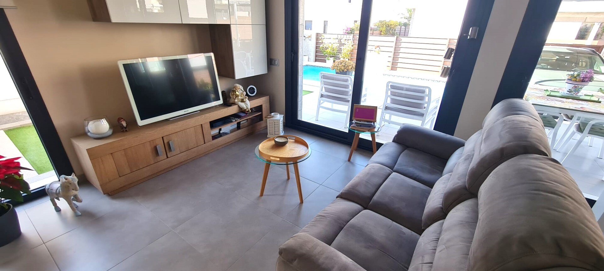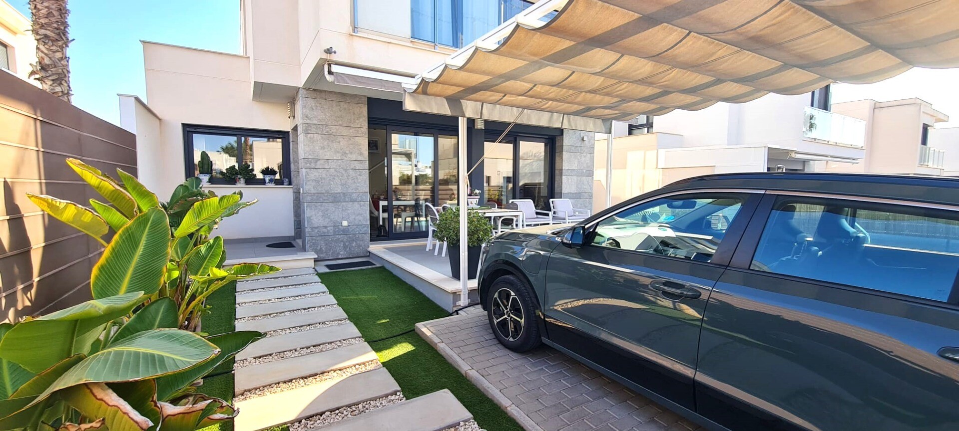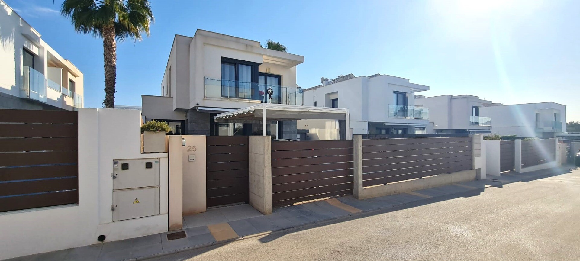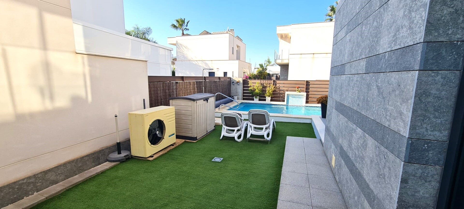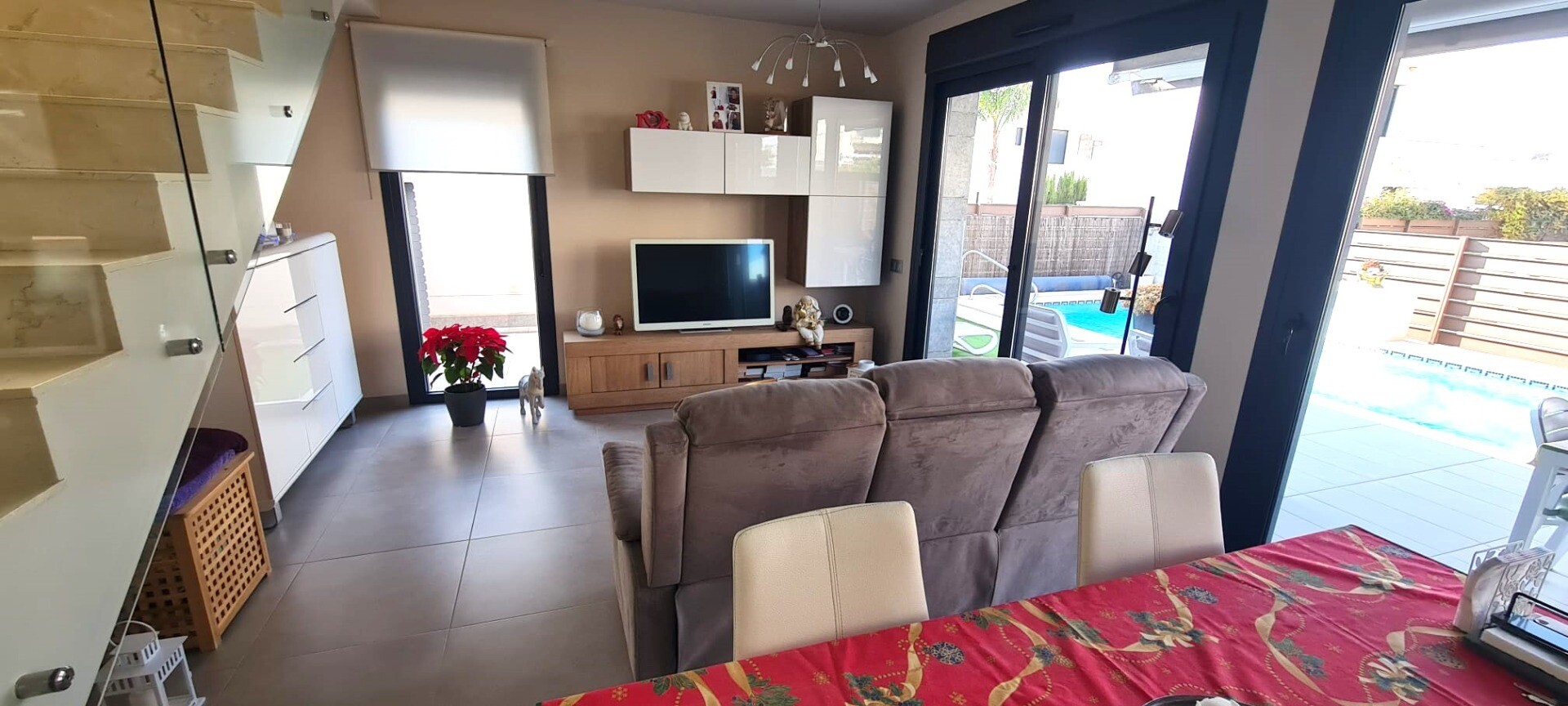Aceasta vila semidecomandata recenta este foarte unica datorita faptului ca a fost construita cu fatadele din spate atingand intre ele, dand impresia ca este o vila decomandata pe un teren de 217m2. Are o piscina incalzita de 3,5x6,5m. Această casă este dotată și cu panouri solare, așa că plătești foarte puțină energie electrică. Casa se vinde part...ial mobilata. Vistabella Golf ar trebui privit mai degrabă ca un mic Pueblo cu toate facilitățile, cum ar fi bancomat, supermarket, diverse baruri și restaurante, farmacie .... cu avantajul că este o zonă complet securizată, cu 1 intrare și ieșire printr-un post de securitate unde plăcuța de înmatriculare a fiecărei mașini este înregistrată electronic. Costurile pentru securitate sunt suportate integral de Vistabella Golf și de promotorul însuși. De aici există o conexiune fixă de autobuz în fiecare joi între Vistabella și La Zenia Shopping Boulevard. De la Vistabella Golf, toate orașele de coastă din Orihuela Costa sunt la 15 minute de mers cu mașina. La Vistabella se poate ajunge de la aeroportul Alicante pe autostradă (fără taxă) în doar 30 de minute cu mașina.