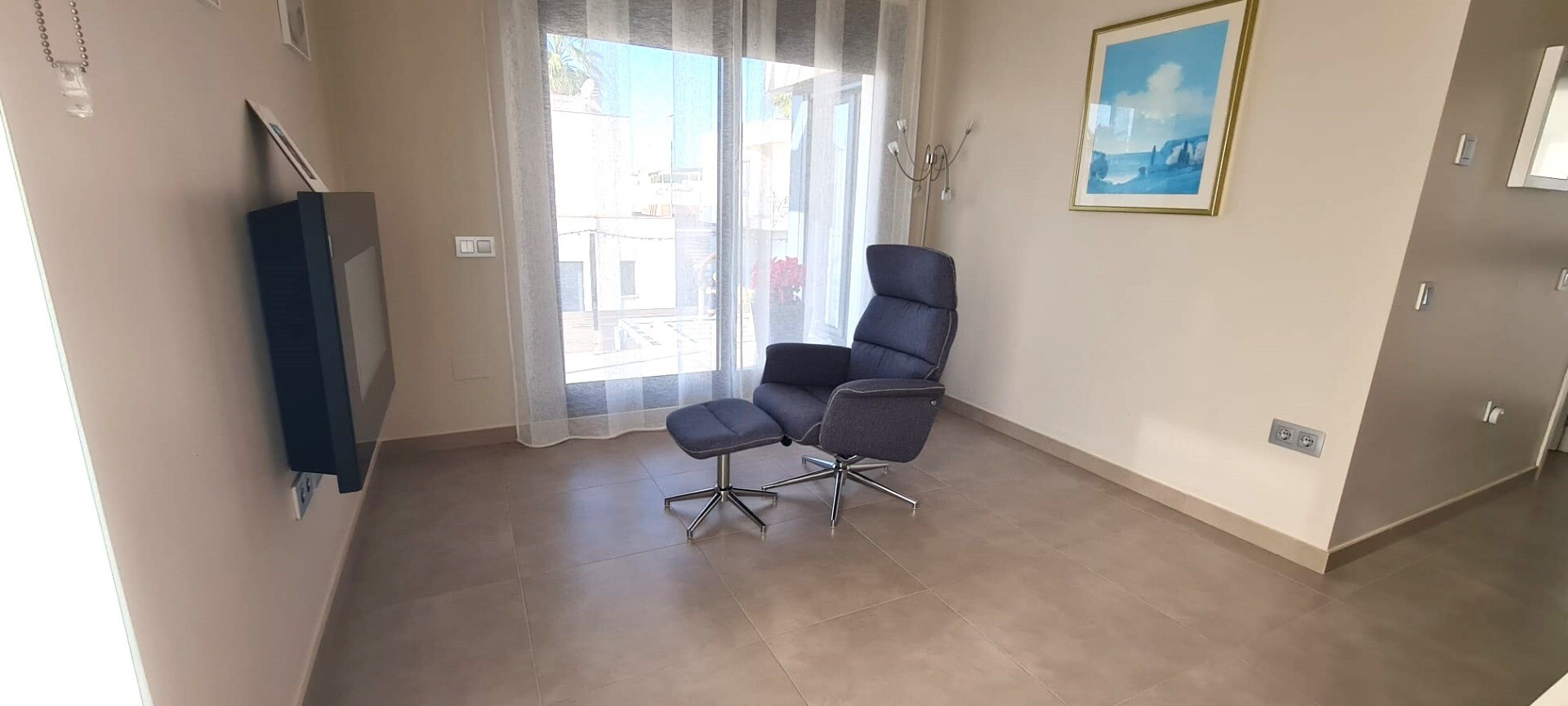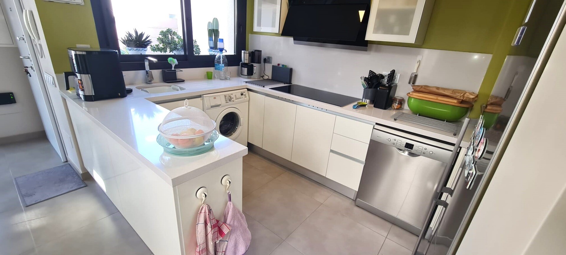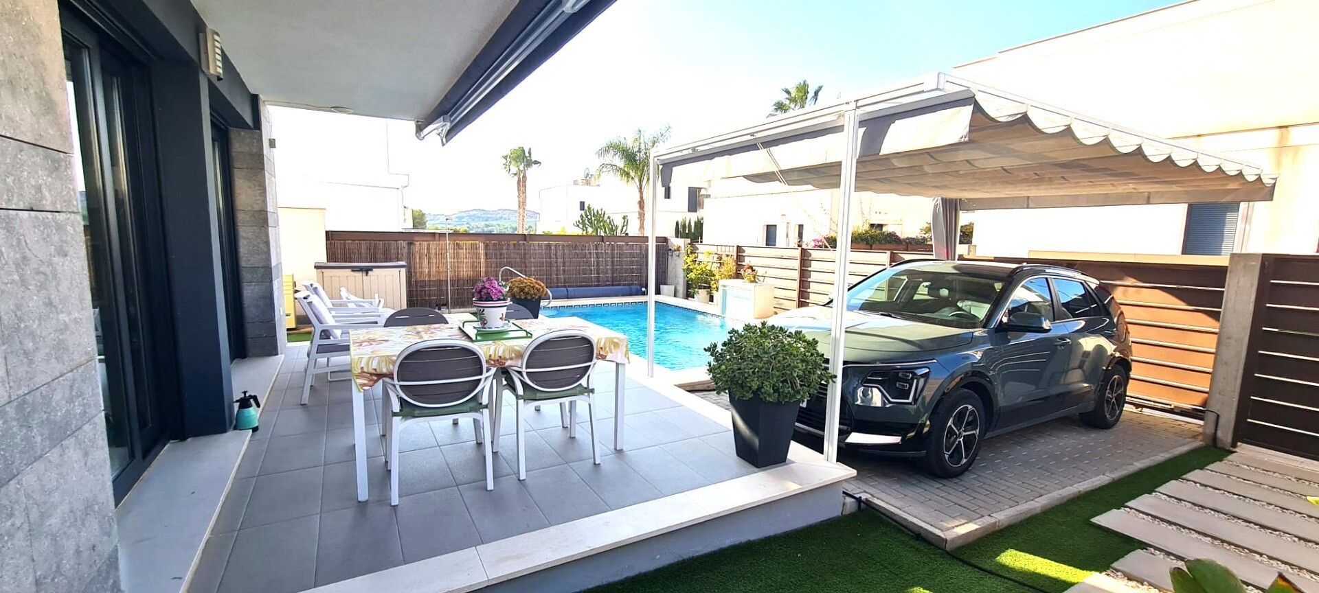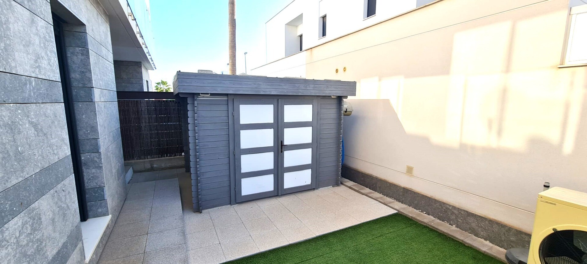 Aceasta vila semidecomandata recenta este foarte unica datorita faptului ca a fost construita cu fatadele din spate atingand intre ele, dand impresia ca este o vila decomandata pe un teren de 217m2. Are o piscina incalzita de 3,5x6,5m. Această casă este dotată și cu panouri solare, așa că plătești foarte puțină energie electrică. Casa se vinde part...ial mobilata. Vistabella Golf ar trebui privit mai degrabă ca un mic Pueblo cu toate facilitățile, cum ar fi bancomat, supermarket, diverse baruri și restaurante, farmacie .... cu avantajul că este o zonă complet securizată, cu 1 intrare și ieșire printr-un post de securitate unde plăcuța de înmatriculare a fiecărei mașini este înregistrată electronic. Costurile pentru securitate sunt suportate integral de Vistabella Golf și de promotorul însuși. De aici există o conexiune fixă de autobuz în fiecare joi între Vistabella și La Zenia Shopping Boulevard. De la Vistabella Golf, toate orașele de coastă din Orihuela Costa sunt la 15 minute de mers cu mașina. La Vistabella se poate ajunge de la aeroportul Alicante pe autostradă (fără taxă) în doar 30 de minute cu mașina.