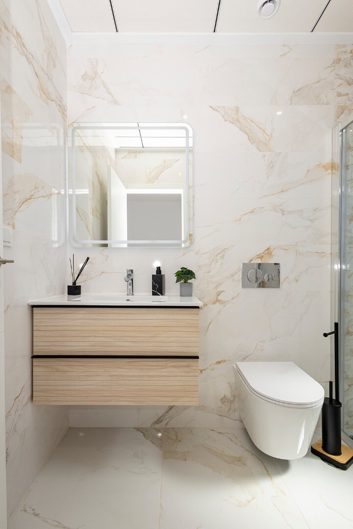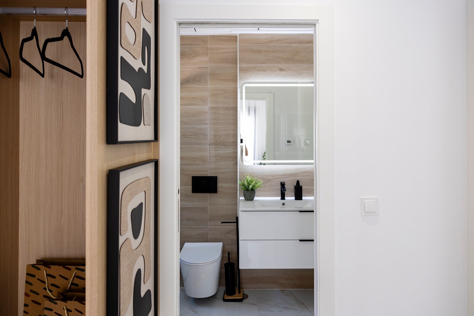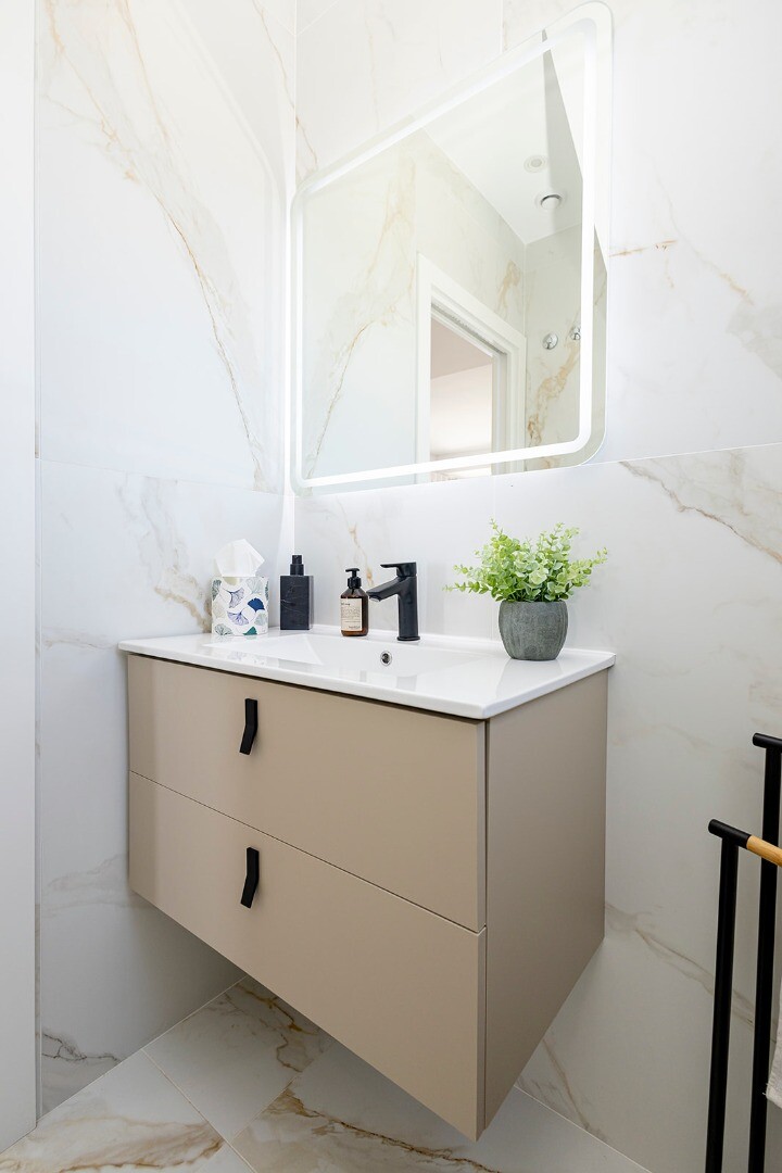 Proprietatea dispune de 3 dormitoare spațioase, fiecare cu baie proprie cu încălzire în pardoseală, plus un toaletă de serviciu. Livingul luminos cu zonă de... luat masa este integrat cu o bucătărie modernă de tip open space, complet utilată.
