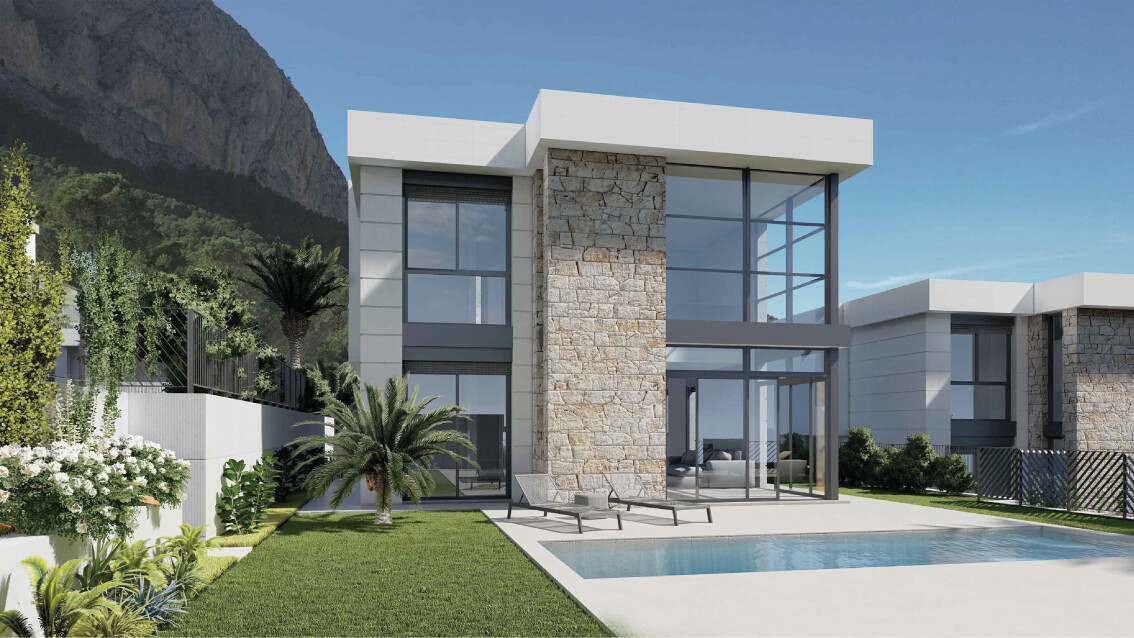 Această vilă contemporană, nou construită și distribuită pe două niveluri, oferă 163 m² construiți pe un teren de 393 m², situat într-o zonă rezidențială liniștită din Polop.
