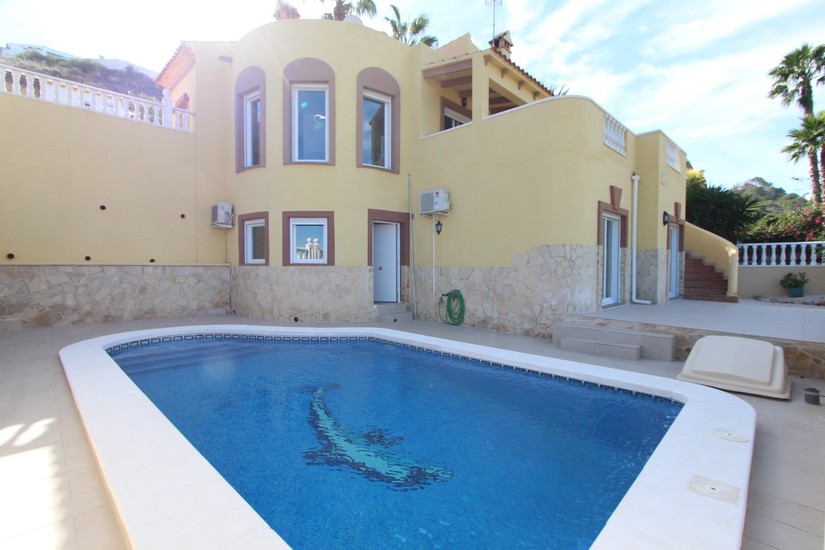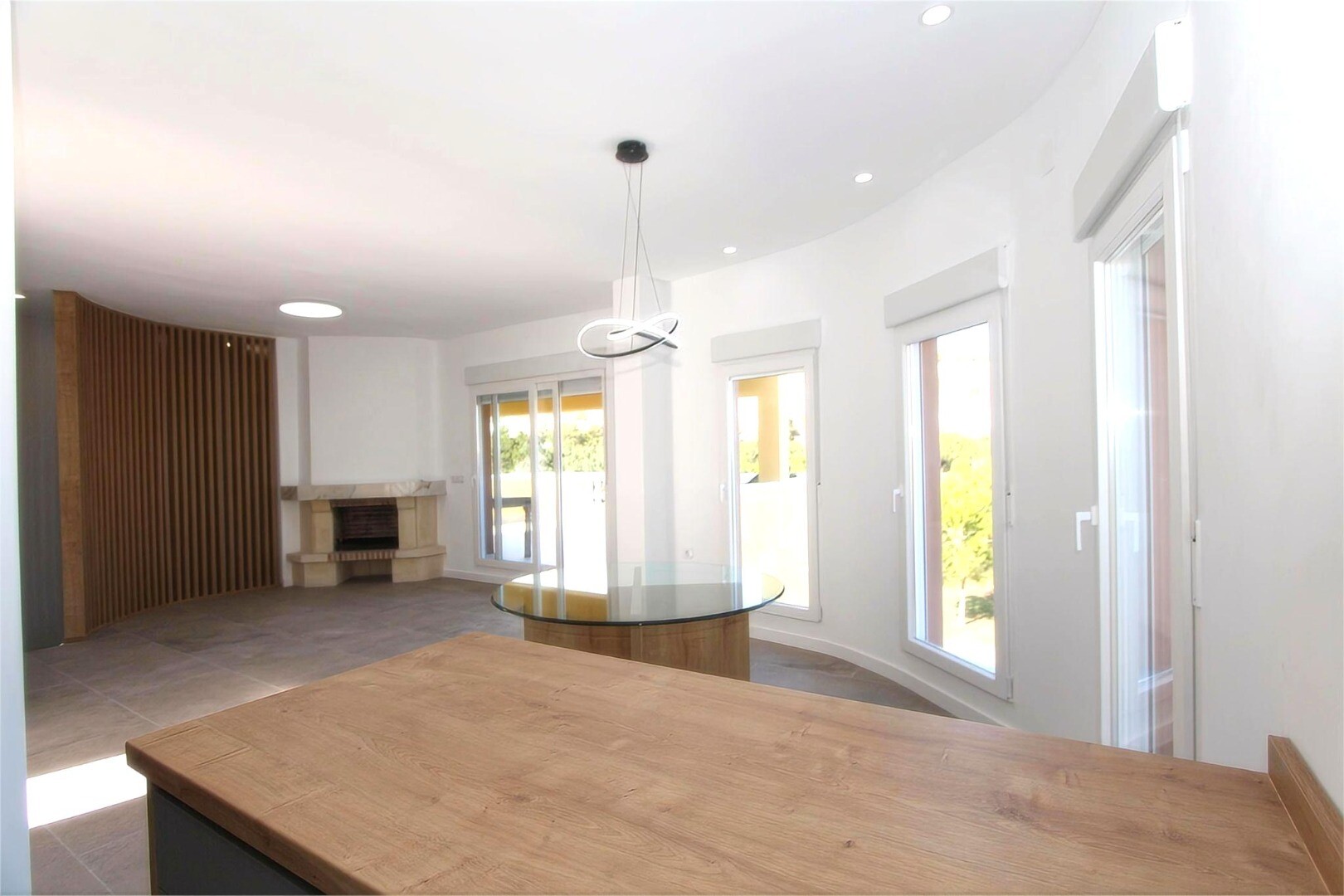 La intrarea în locuință, primul lucru pe care îl întâlnim este un living-dining spațios și luminos, cu ferestre mari și acces la o terasă mare, parțial acoperită, care oferă vederi magnific deschise și intimitate totală.Bucătăria, de tip open space, este complet utilată cu mobilier superior și inferior, precum și cu electrocasnice de calitate. Se i...ntegrează perfect cu zona de luat masa, unde se remarcă un șemineu primitor care conferă căldură atmosferei.Tot pe acest etaj se află și un dulap practic și o toaletă pentru oaspeți.Zona de odihnă se află la etajul inferior, la care se ajunge printr-o scară comodă. Aici găsim o baie completă, un dormitor pentru oaspeți, un alt dormitor cu baie proprie și dormitorul principal, spațios și elegant, cu propria baie și dressing.Fiecare dormitor are acces direct la terasele inferioare, unde se află piscina privată, un spațiu perfect pentru relaxare.