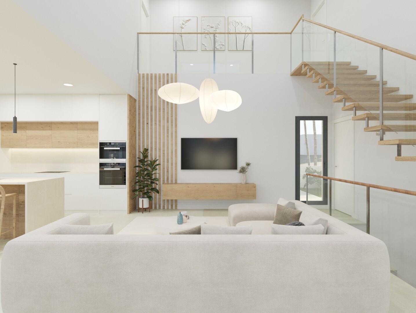 La parter se remarcă livingul cu tavan înalt, bucătăria open space cu insulă, un dormitor ...și o baie. Etajul superior dispune de două dormitoare cu baie proprie, fiecare cu acces la terase private. Subsolul de 105 m² oferă numeroase posibilități de personalizare.