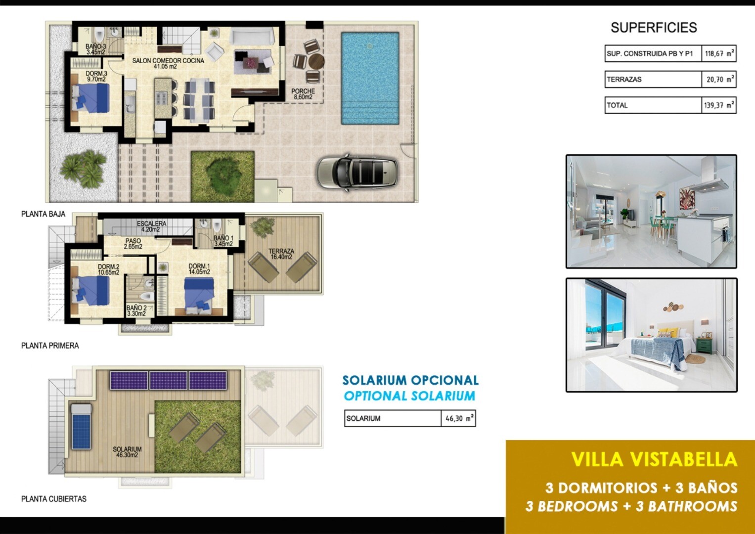 Vilele vor fi construite in 2 faze si vor fi livrate cu iluminat, bai complet finisate cu paravane de dus, electrocasnice de bucatarie, preinstalare A/C prin conducte de aer, incalzire prin alimentare in bai, panou solar pentru centrala si 3 in plus. panouri solare pentru energie electrică prin care se poate obține un certificat EPC A. Optional se ...poate instala si un solar de acoperis. Vistabella Golf ar trebui considerat mai degrabă un mic Pueblo cu toate facilitățile precum bancomat, supermarket, mai multe baruri și restaurante, farmacie.... cu avantajul că este o zonă complet securizată, cu 1 intrare și ieșire printr-un post de securitate unde fiecare numărul de înmatriculare al mașinii este înregistrat electronic. Costurile de securitate sunt suportate integral de Vistabella Golf și de însuși promotor. De aici există o conexiune regulată de autobuz în fiecare joi între Vistabella și La Zenia Shopping Boulevard. De la Vistabella Golf, toate orașele de coastă din Orihuela Costa sunt la 15 minute de mers cu mașina. La Vistabella se poate ajunge de la aeroportul Alicante pe autostradă (fără taxă) într-o mașină de doar 30 de minute.